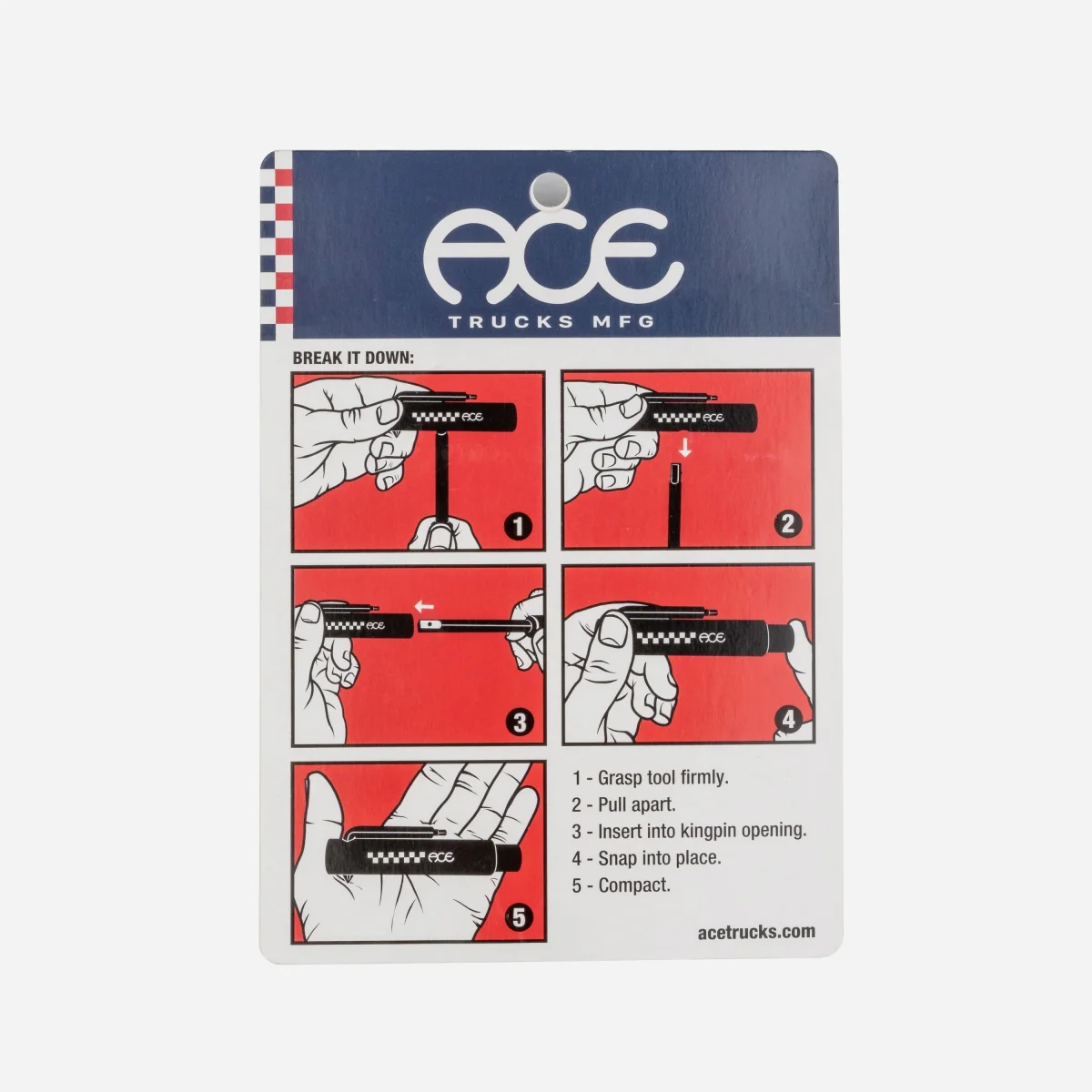 Outil Ace Trucks pour skateboard avec tout ce dont vous avez besoin pour monter/régler vos trucks. Forme en T classique lorsqu’il est assemblé et super compact une fois replié.