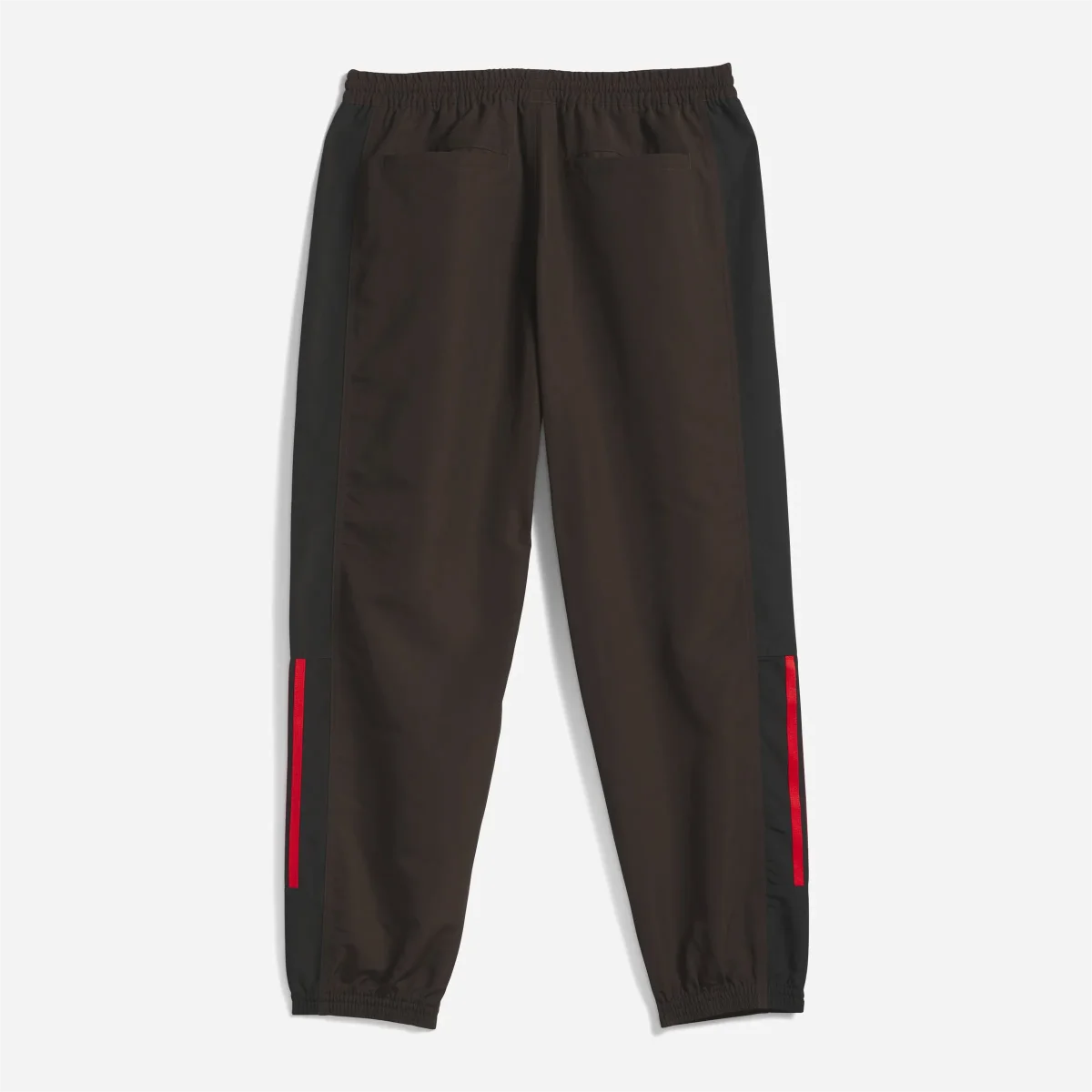 - Color-Block Puissant : La base marron café est structurée par des panneaux latéraux noirs qui affinent la silhouette. L’élément clé réside dans les trois bandes rouges situées sur le bas des jambes, créant un contraste visuel fort à chaque poussée sur la planche.