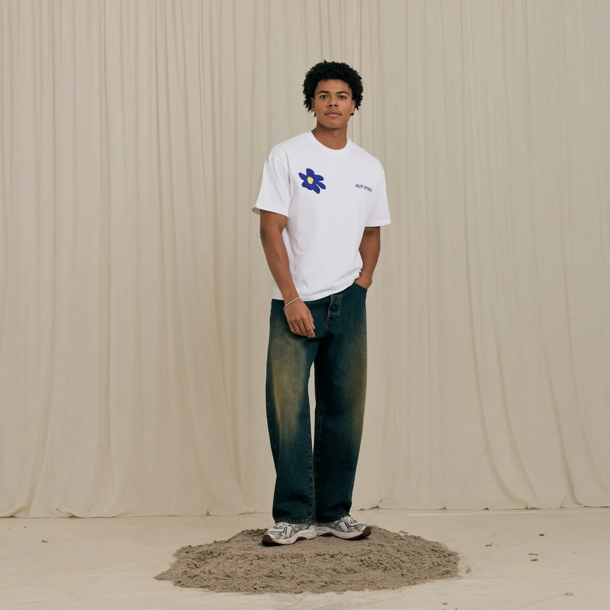 Double Broderie : Ce modèle joue l’asymétrie avec une fleur « Violet Blue » brodée d’un côté et le logo typographique Arbor Antwerp de l’autre. Un contraste saisissant sur le coton blanc immaculé.