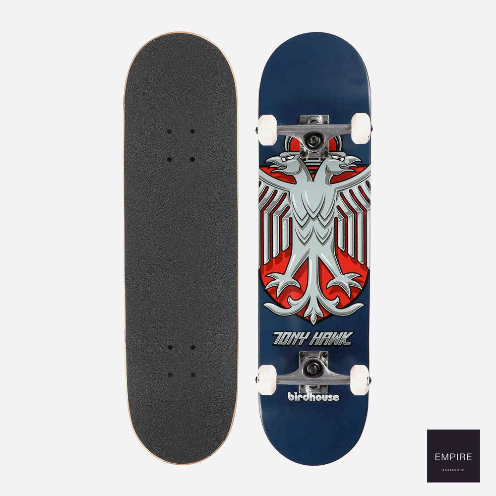 BIRDHOUSE COMPLETE HAWK SHIELD BLUE 8.0 » Skateboard complet, planche réalisée en bois d’érable canadien 7-plis et résine époxy, en taille 8.0 x 31.5 inch. Montée avec des trucks Birdhouse 5 », des roues Birdhouse diamètre 52mm et duro 95A, des roulement Abec 5 et un grip.