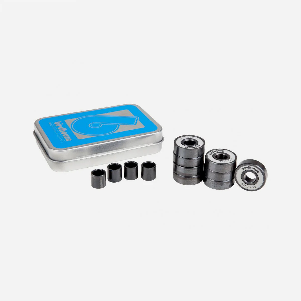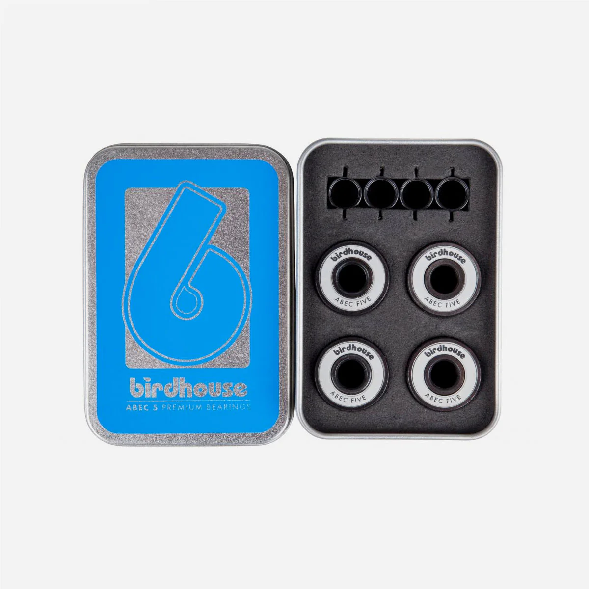 Jeux de huit roulements Birdhouse en acier pour roues de skateboard. Qualité Abec 5. Livré dans une boite en acier avec quatre spacers.