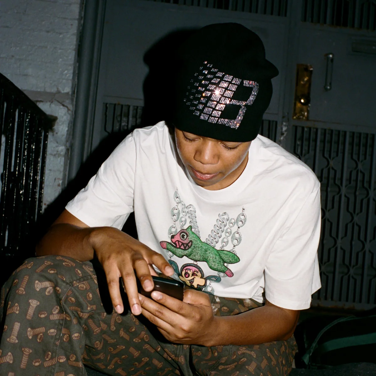 Découvrez le Rhinestone Beanie Black, fruit de la collaboration emblématique entre Bronze 56K et Ice Cream. Ce bonnet allie l’esthétique skate new-yorkaise brute de Bronze à l’univers ludique et coloré d’Ice Cream. Entièrement noir, il brille grâce à ses motifs rhinestones détaillés : le logo « 56K » en pixel art d’un côté et le mythique « Running Dog » de l’autre. Stretch et thermorégulant, il offre confort et chaleur en toute saison.