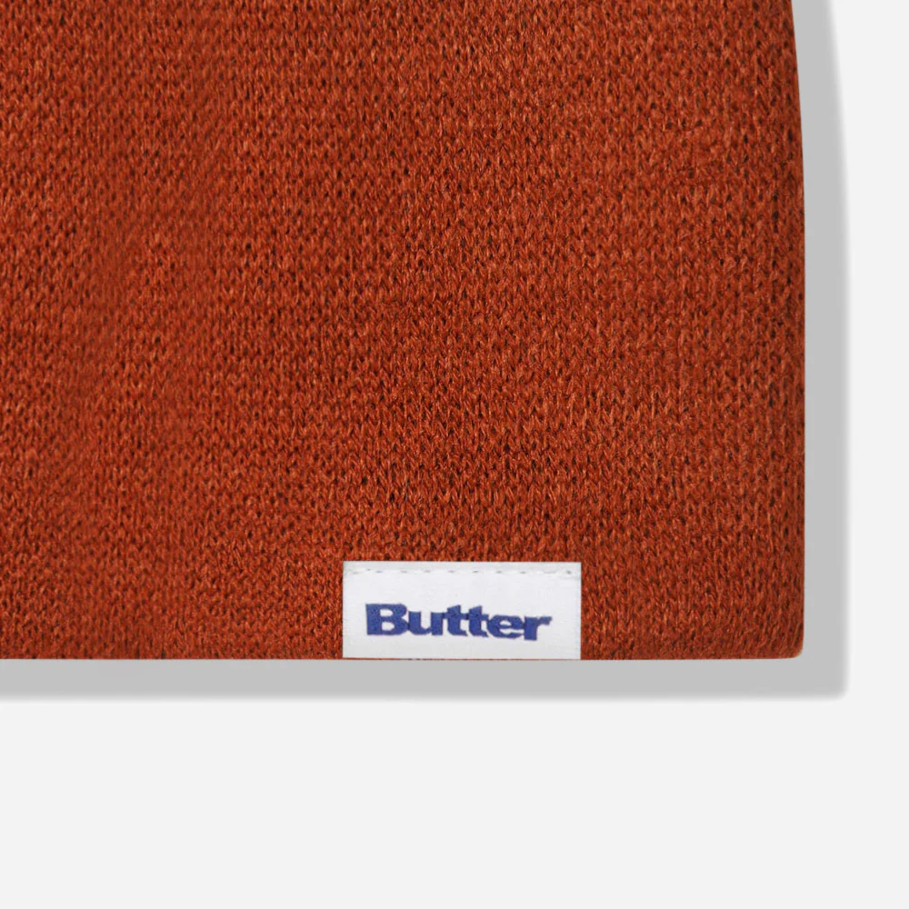 Bonnet Butter Goods sans revers, coupe courte, motif jacquard et étiquette Butter cousu sur le bord.