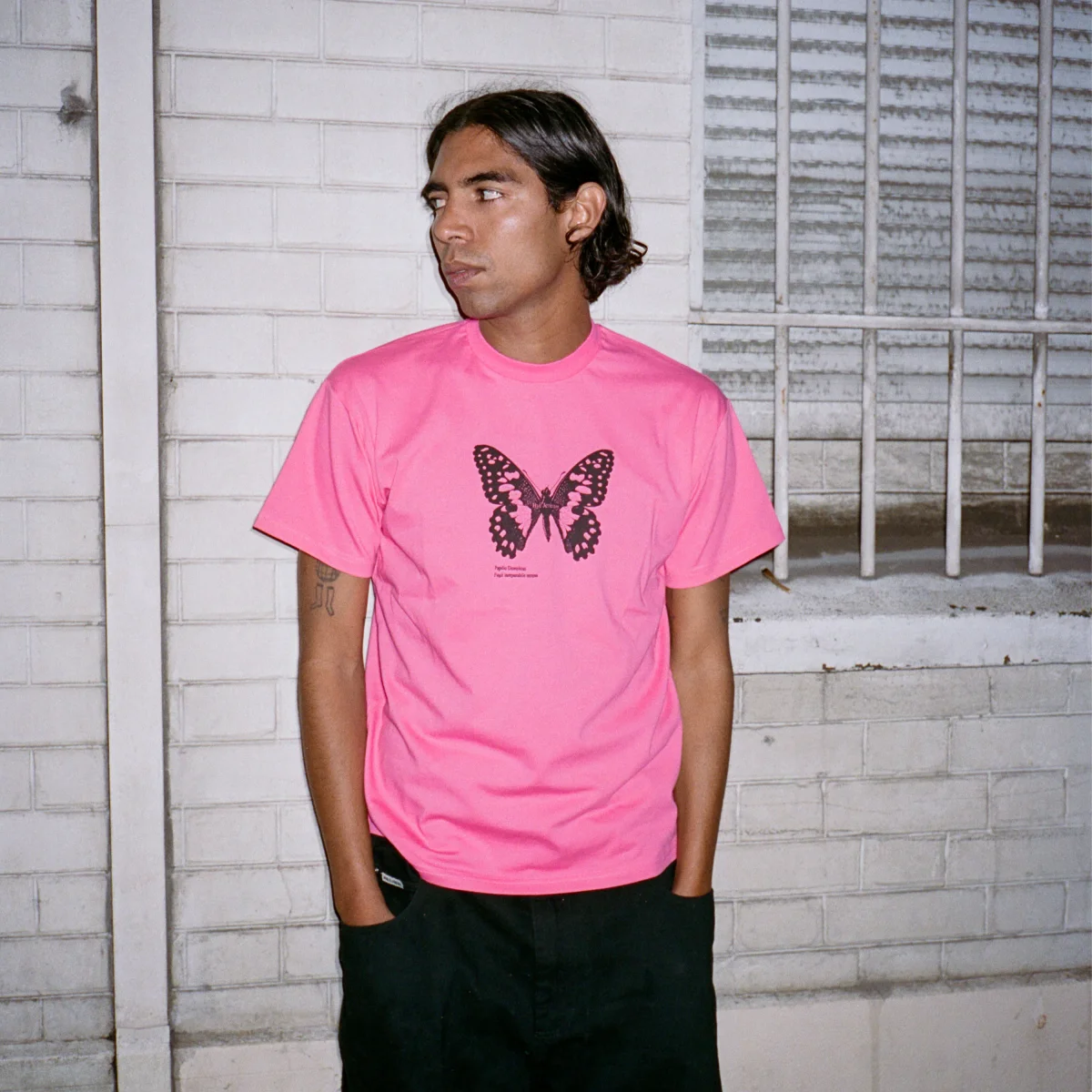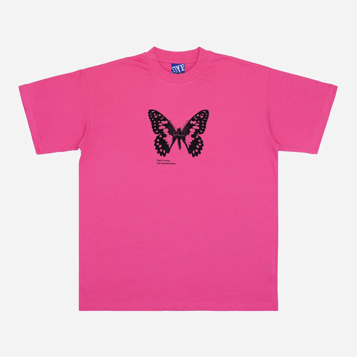 La base en rose vif (Hot Pink) du t-shirt sert de toile de fond parfaite pour le graphisme central : un papillon stylisé noir aux détails complexes. Ce contraste puissant entre le fond pop et l’illustration sombre crée un impact visuel immédiat, fidèle à l’ADN graphique de la marque. De fines inscriptions typographiques sous le motif ajoutent une touche de sophistication technique au design.