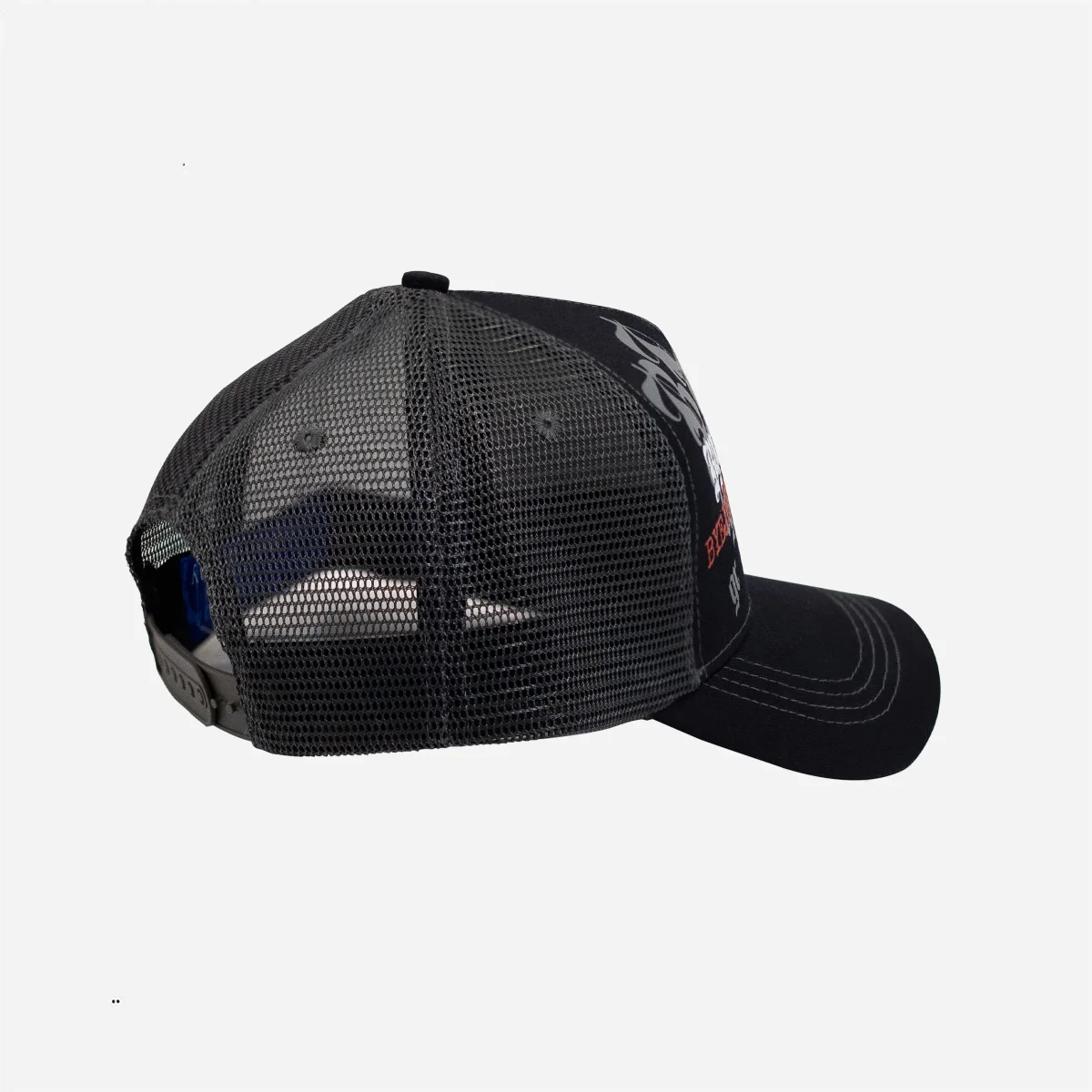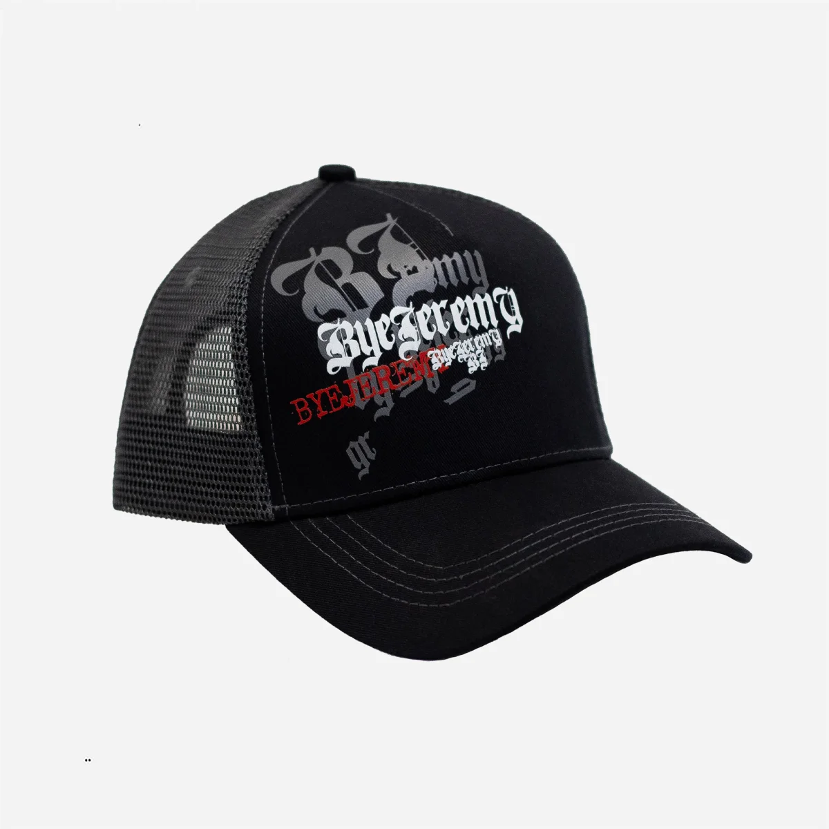 Casquette Bye Jeremy, style trucker avec visière courbe, logos imprimés sur l’avant. Taille ajustable.