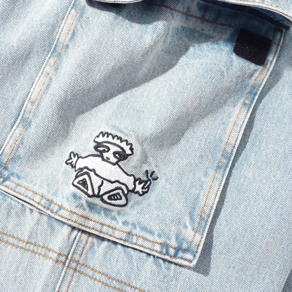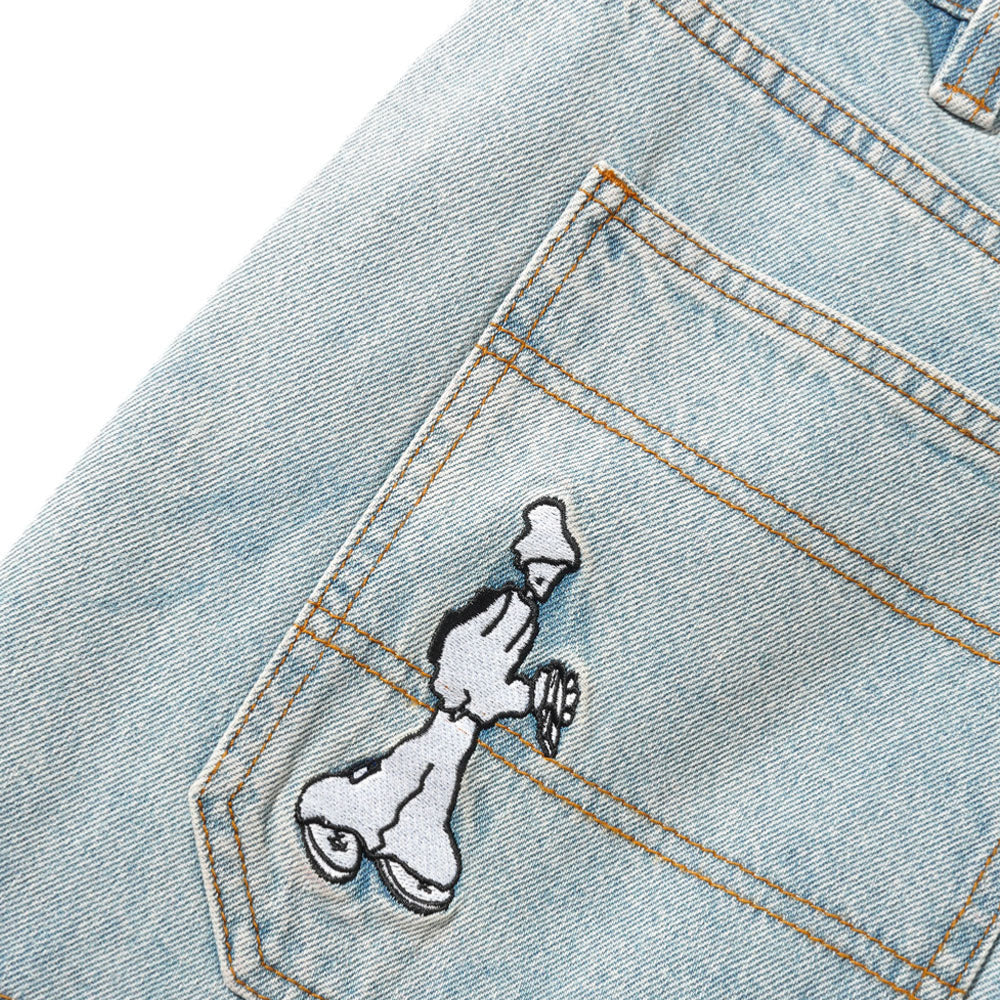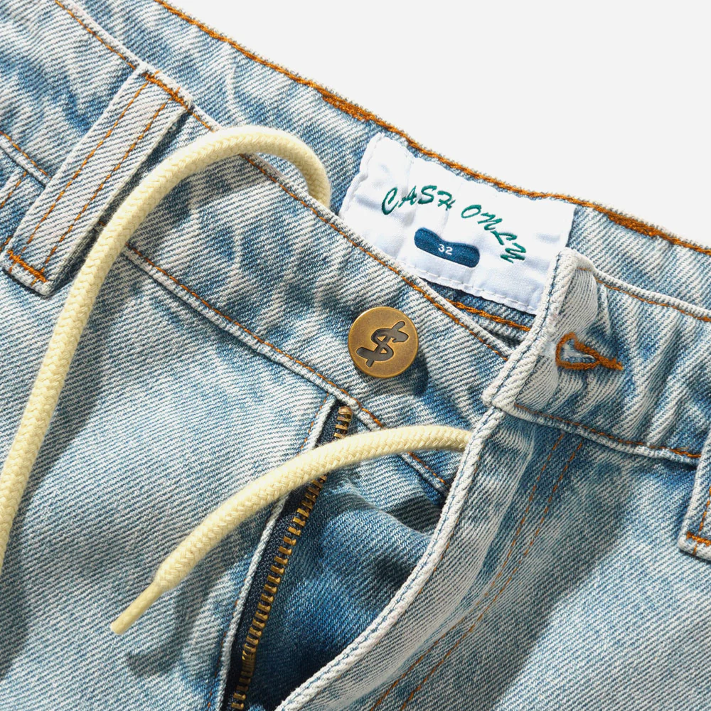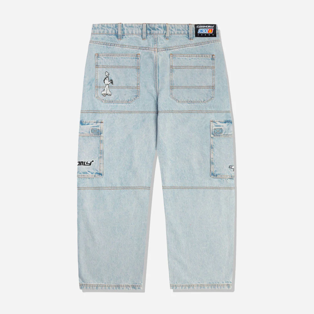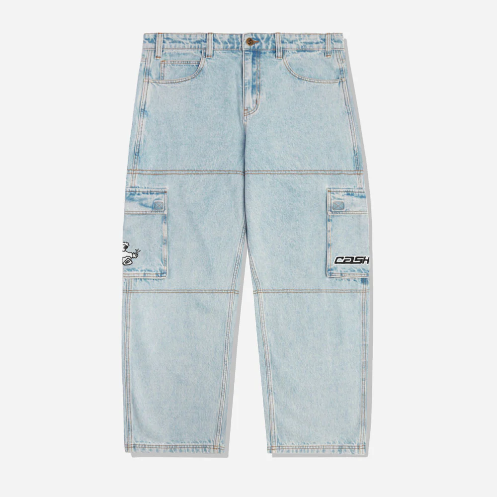 Pantalon cargo en denim ultra baggy léger rétrécissement à partir du genou surpiqûres contrastées. Graphique brodé sur la poche arrière. Poches cargo 3D sur les côtés avec fermetures velcro et broderie, cordon de serrage à la taille. Étiquette tissée sur la bande de taille arrièreVoir tout CASH ONLY