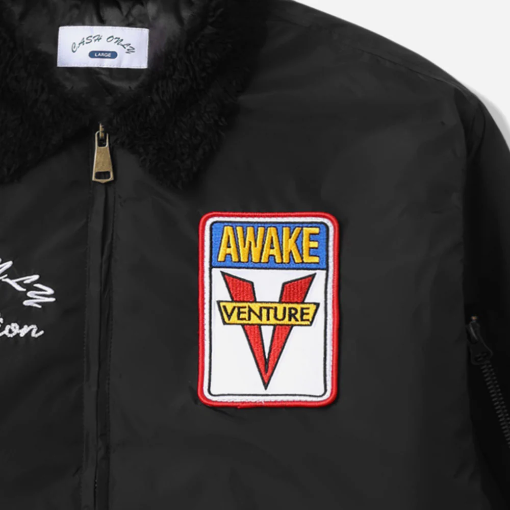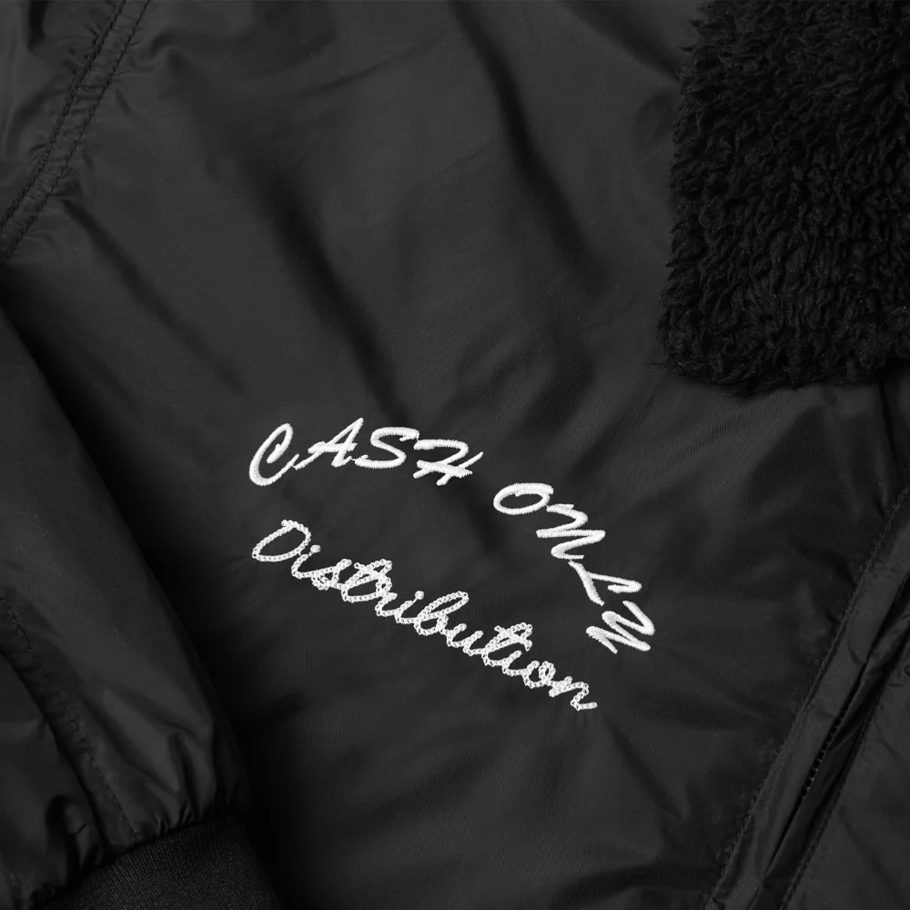 Veste réalisée en collaboration entre Cash Only et Venture. Coupe bomber, isolé en nylon avec fermeture à glissière métallique. Broderie et écusson à bords froncés sur le devant. Col en fausse fourrure et doublure en satin. Grande broderie haute densité au dos avec lettres en point de chaînette. Poches sur le devant, le bras et à l’intérieur. Élastiques aux poignets, à l’ourlet et au col.