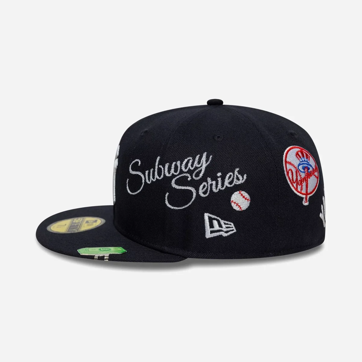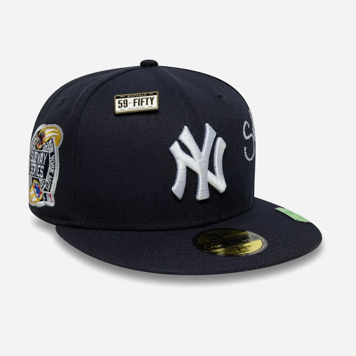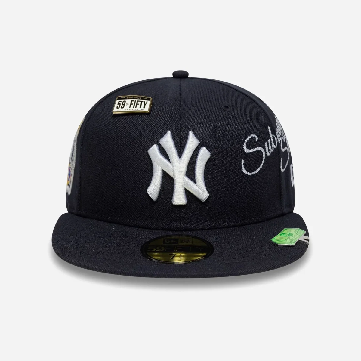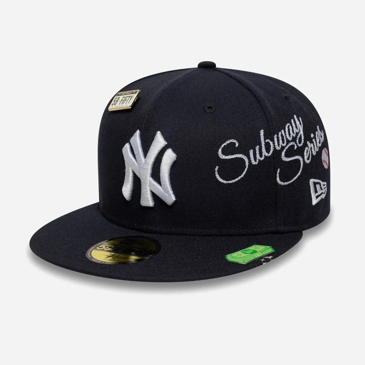 Accessoires Exclusifs : Cette édition est livrée avec deux superbes pièces métalliques : un pin’s exclusif « Buffalo 59FIFTY » doré fixé sur le haut de la couronne à droite, et un original clip de visière métallique « New Era Cash » (liasse de billets) fixé sur le côté gauche de la visière. Ultime détail : une inscription « Subway Series » est brodée sous la visière à droite.