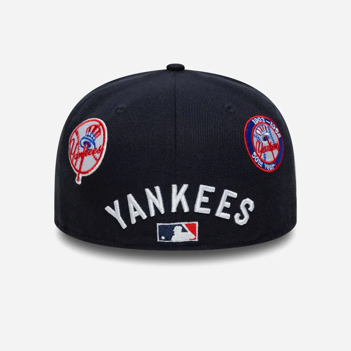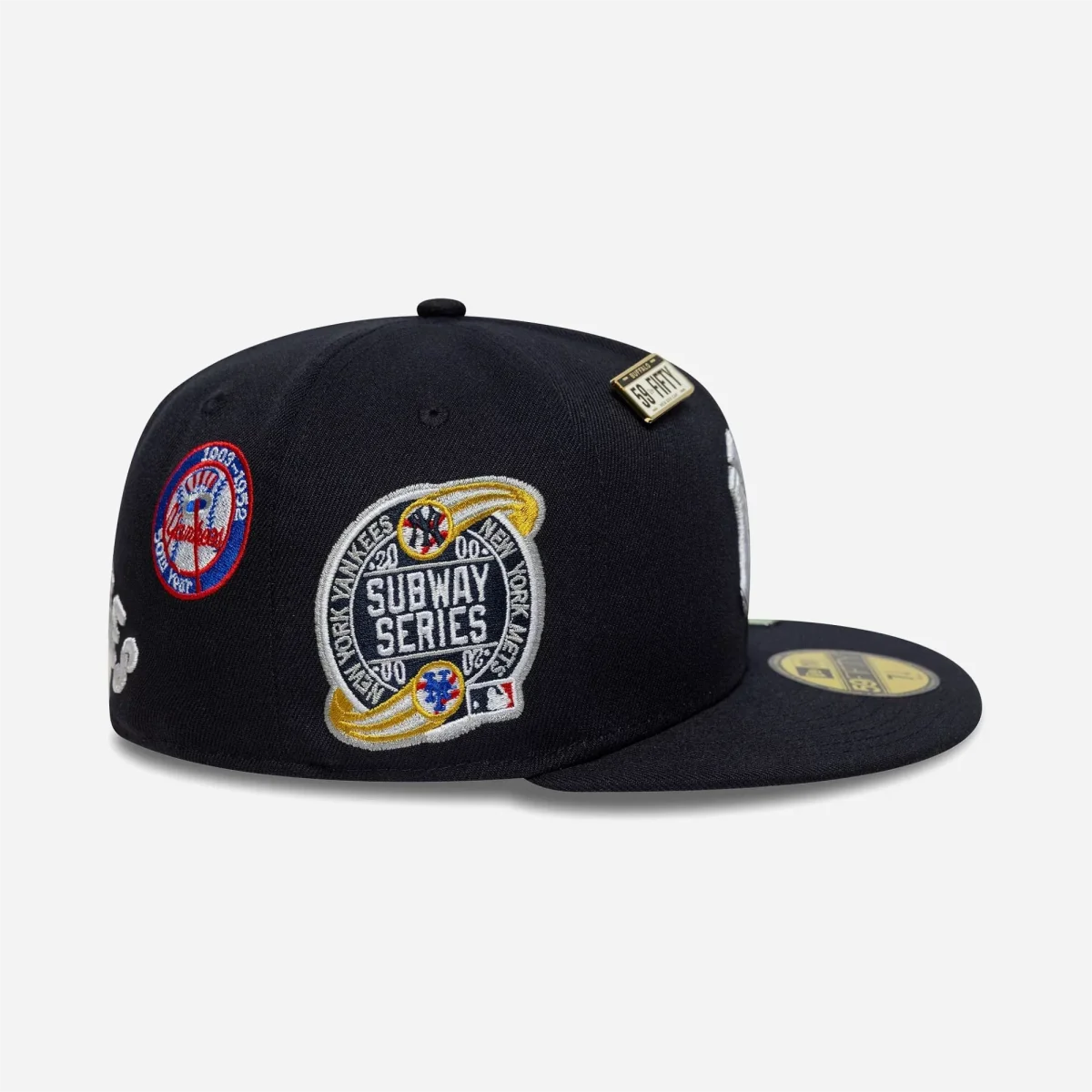 Patchs & Dos Historiques : Le côté droit est dominé par l’immense patch officiel commémoratif des Subway Series. L’arrière de la couronne est orné de deux patchs vintage « Cooperstown Yankees » sur les panneaux latéraux, encadrant l’inscription « YANKEES » et le logo tricolore de la MLB.
