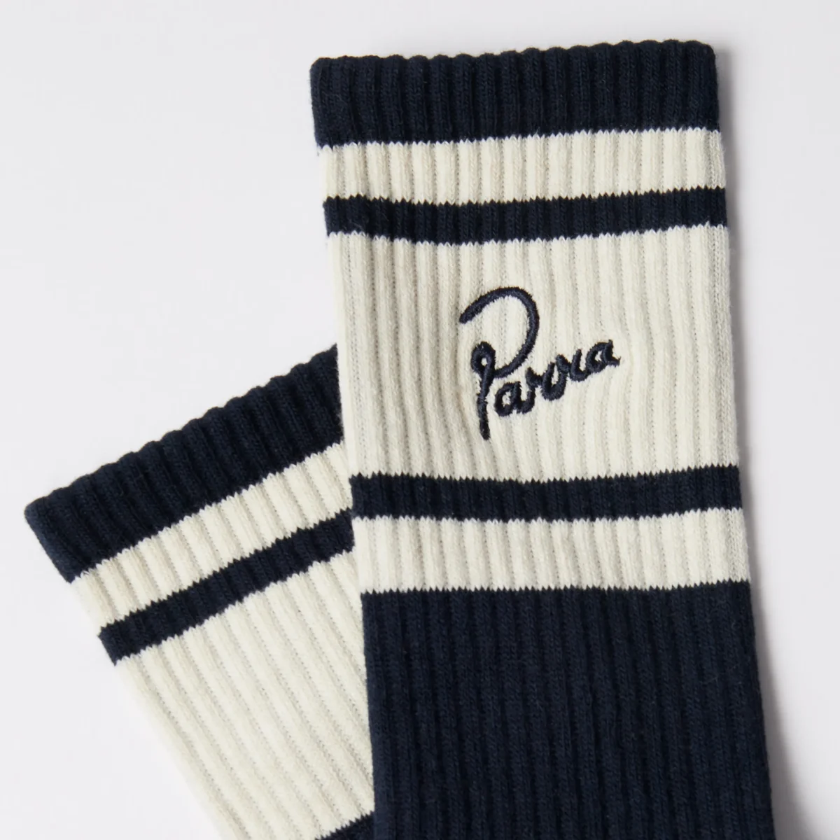 • Détail Signature : Le célèbre logo script « Parra » est délicatement brodé en bleu marine sur le haut de la chaussette.