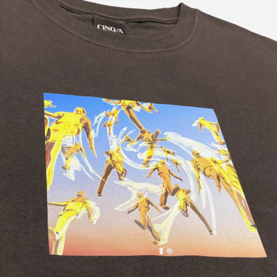 T-shirt Cinq/A faisant partie de la nouvelle collection « Chrome » sérigraphié à la main en France, chaque pièce est unique. Tag avec logo Cinq/A au niveau du bord de cote.