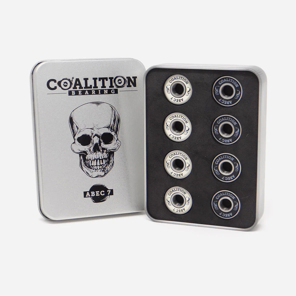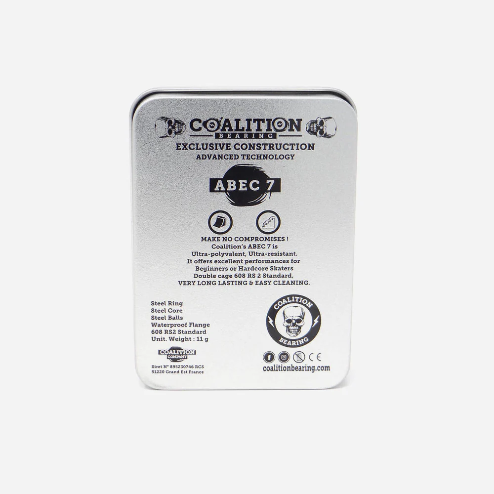 Jeu de huit roulements à billes d’acier de qualité Abec 7 pour roues de skate, reconnaissable par sa double cage 608RS2 de couleur noir d’un coté et blanc de l’autre, référence en terme de longévité et de facilité d’entretien. Livrés dans une boite métallique.