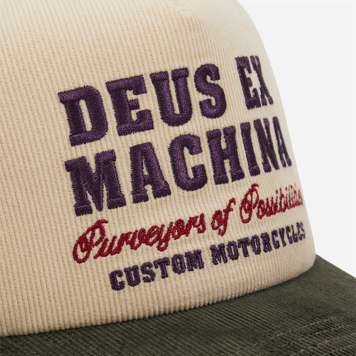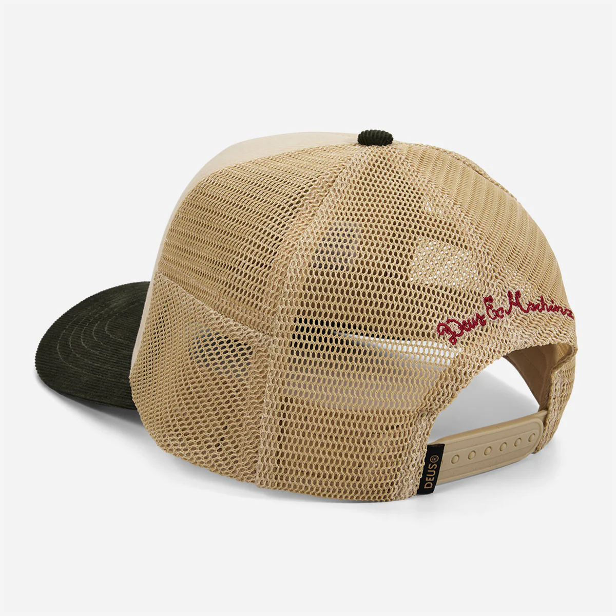 Casquette Deus de type classique trucker avec un large broderie Deus cousu à l’avant et petit Logo à l’arrière. Panneau avant et visière en velours côtelé. Taille réglable grâce a son système d’ajustement au niveau de la nuque.