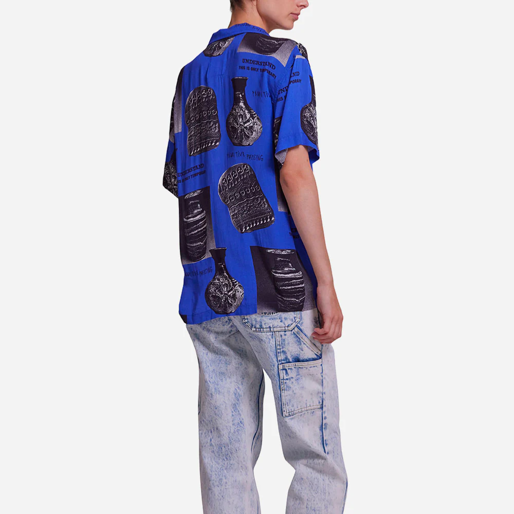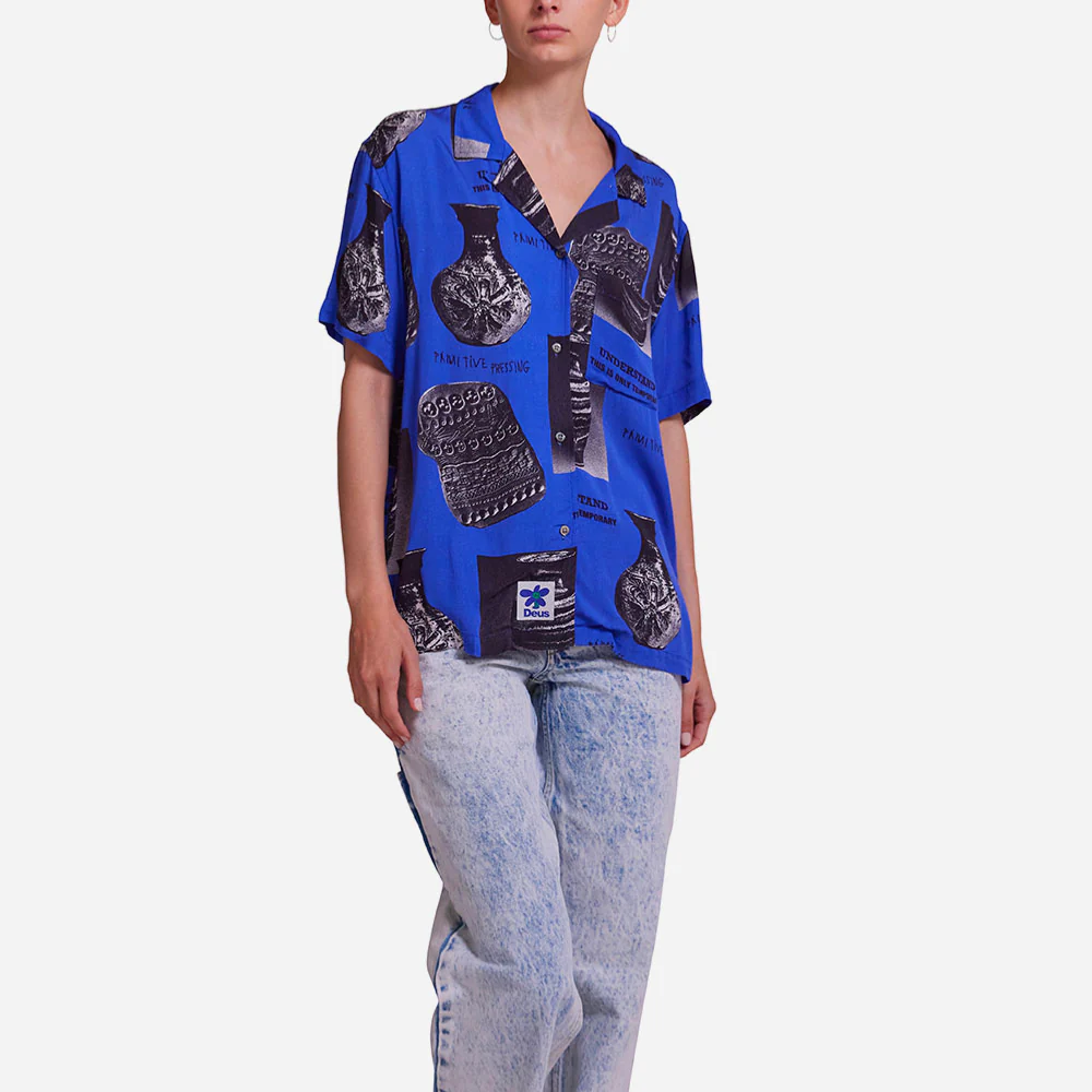 Chemise manches courtes, coupe décontractée, réalisée dans une pure viscose donant un aspect ultra fluide sans brillance. Imprimé all-over, poche poitrine avec étiquette Deus, fermeture à boutons nacrés.