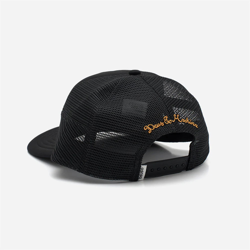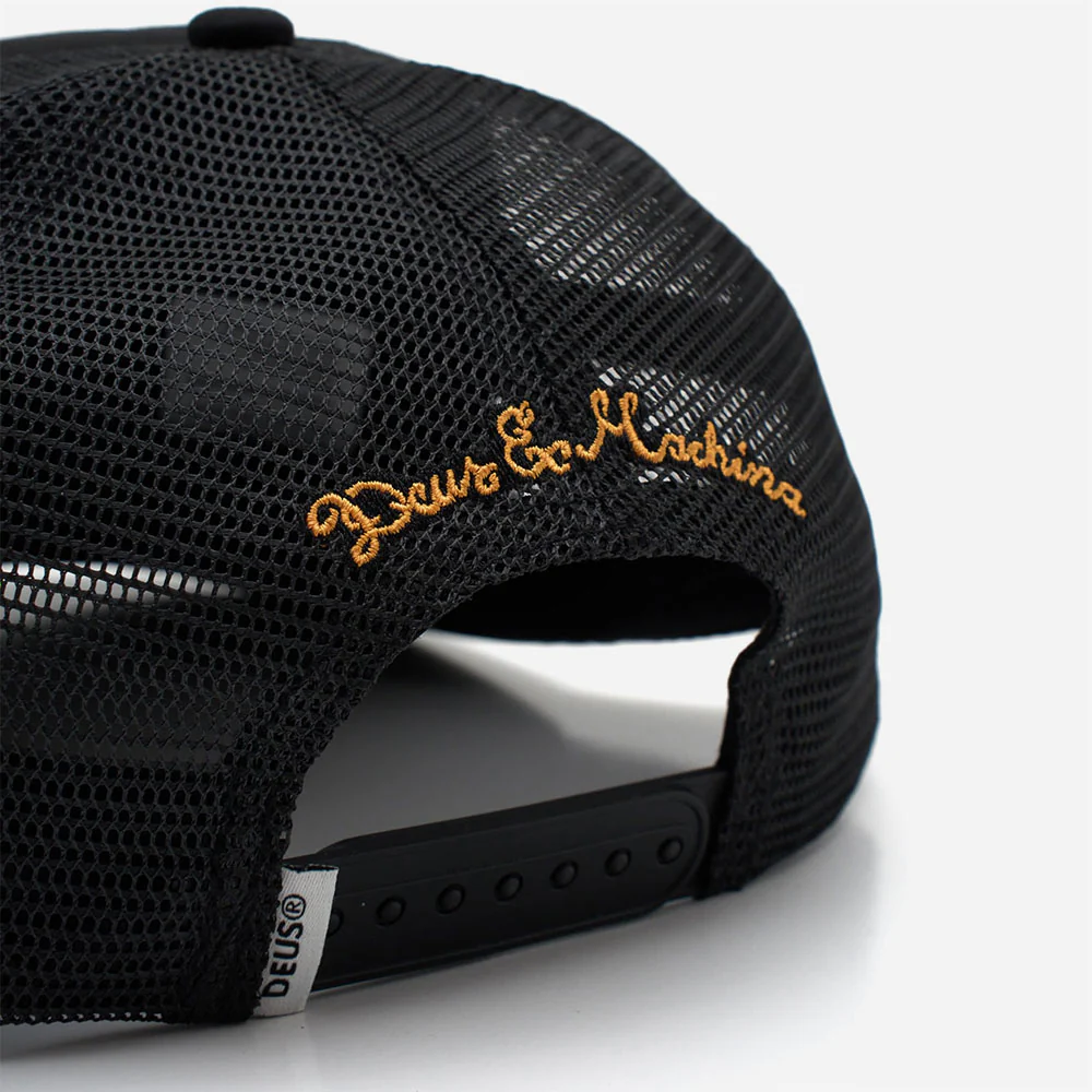 Casquette Deus de type classique trucker avec un large patch Deus cousu à l’avant et petit Logo à l’arrière. Taille réglable grâce a son système d’ajustement au niveau de la nuque.