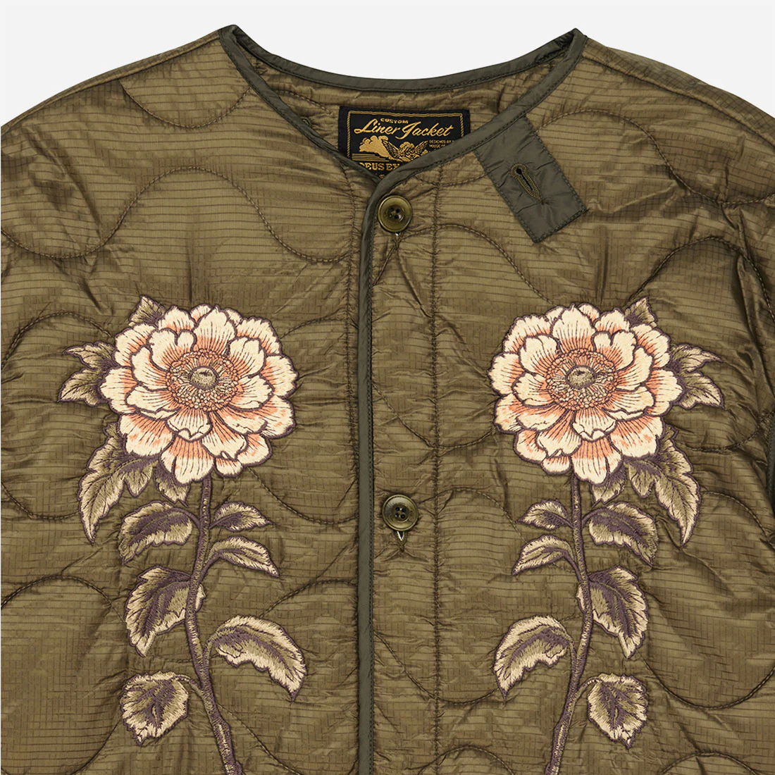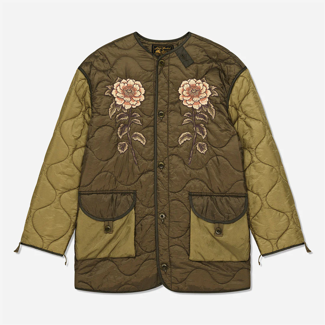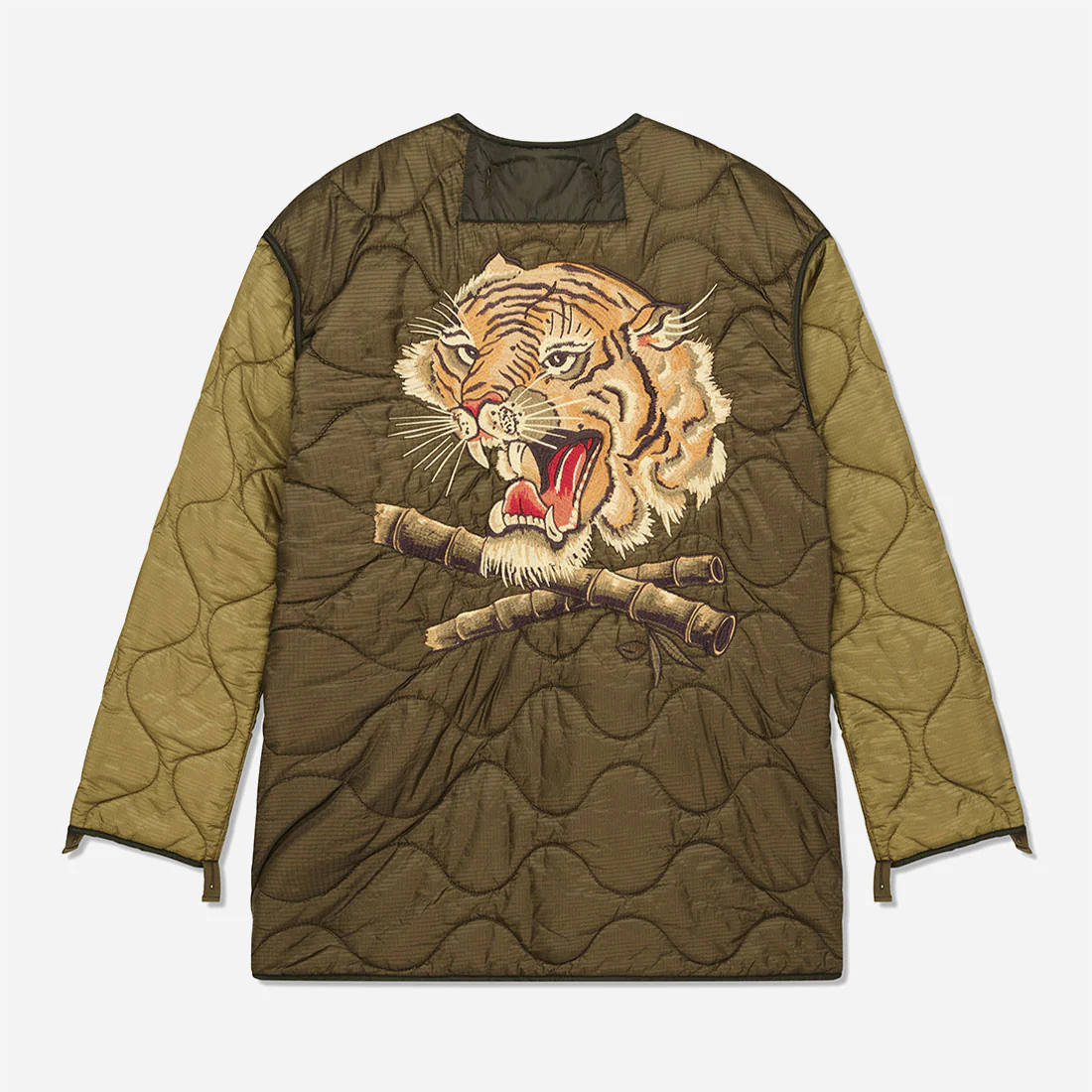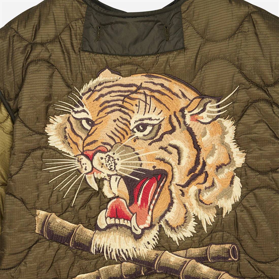 Veste Deus oversize ornée de grandes broderies mates à l’arrière et sur la poitrine. Fermeture à boutons en corozo au centre sur le devant, poches plaquées à soufflet dans le bas avec tirettes en coton et boutons en corozo. Bordures contrastées en nylon aux coutures, détails vintage reproduits avec des pattes en nylon. Confectionnée en nylon ripstop matelassé avec manches et poches légèrement contrastées.