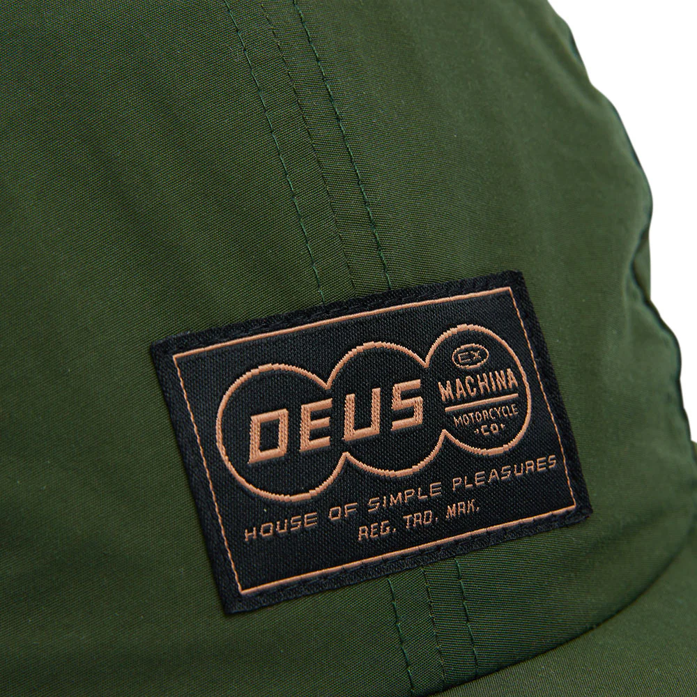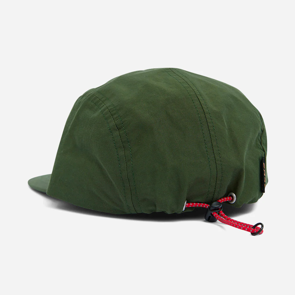 Casquette à 4 panneaux avec étiquette tissée à l’avant, broderie à l’arrière, cordon élastique et réglage à bascule en plastique dans un mélange de coton et de nylon