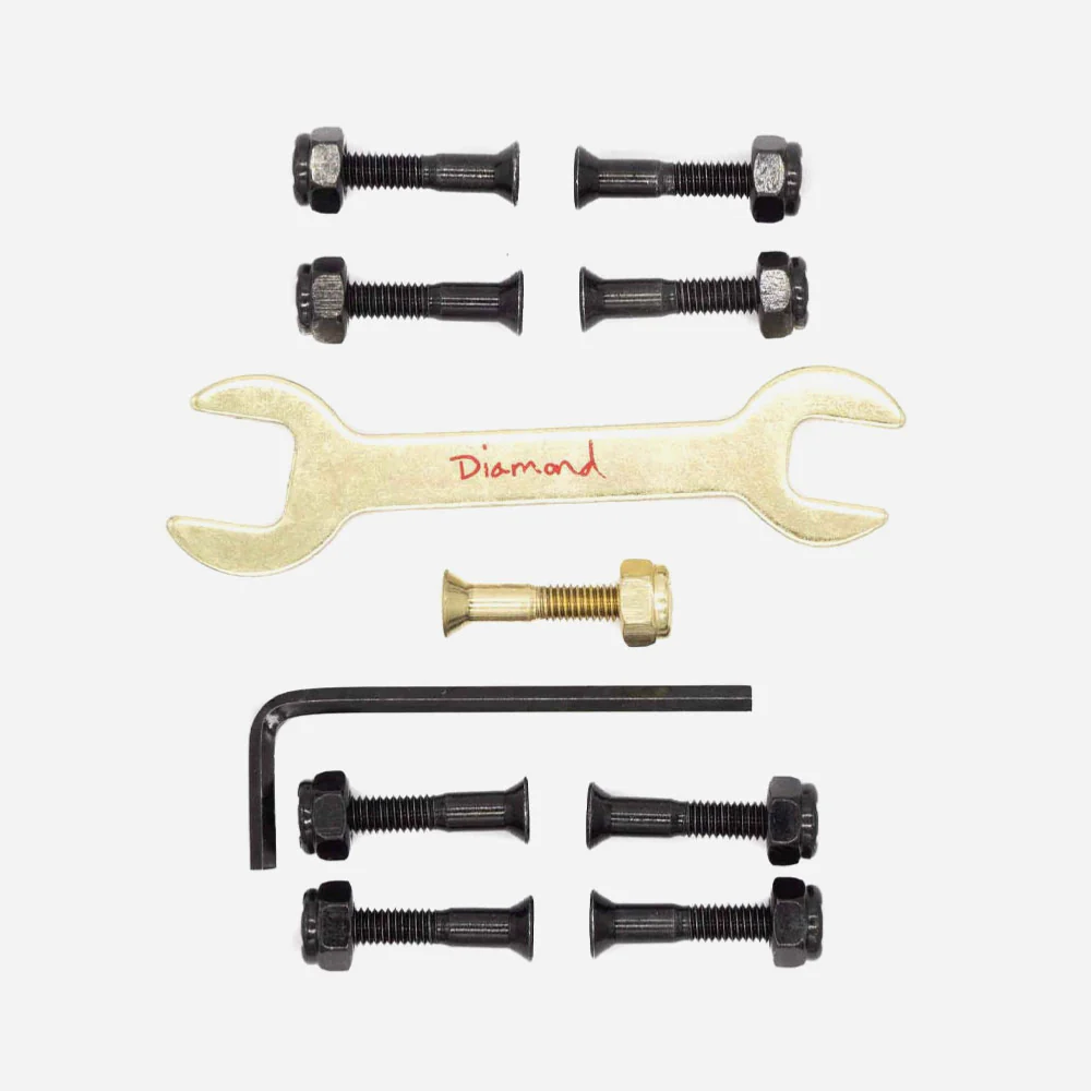 Visserie du pro-rideur Diego Najera. Composé de huit vis 1″ avec écrous (sept noires et une doré), une clef allen et une clef à boulon.