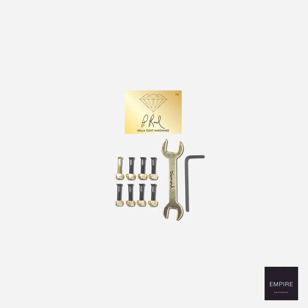 DIAMOND PAUL RODRIGUEZ PRO HARDWARE GOLD. Visserie du pro-rideur Paul Rodriguez. Composé de huit vis 7/8″ avec écrous (sept noires et une doré), une clef allen et une clef à boulon.