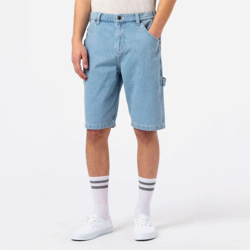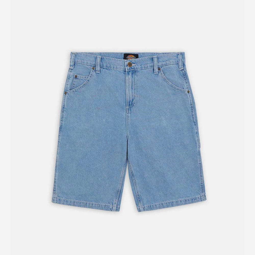 Short en jean Garyville coupe droite taille haute, avec plusieurs poches utilitaire. Fabriqué dans un denim résistant 350g avec des coutures contrastantes. Logo Dickies sur la poche arrière