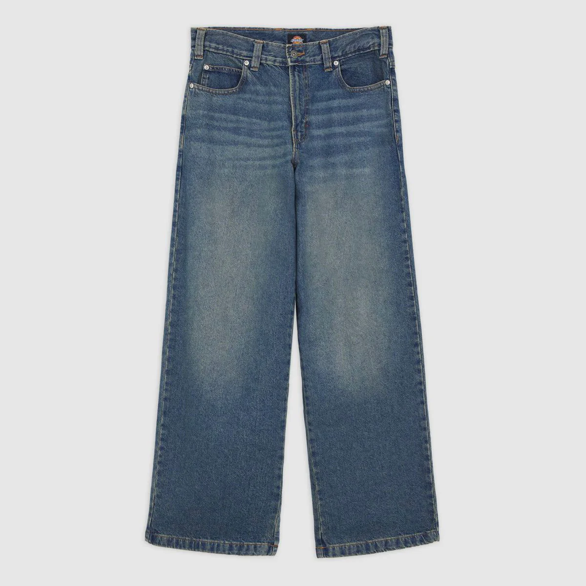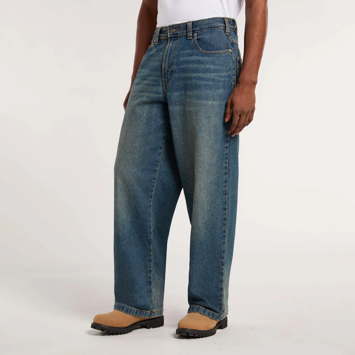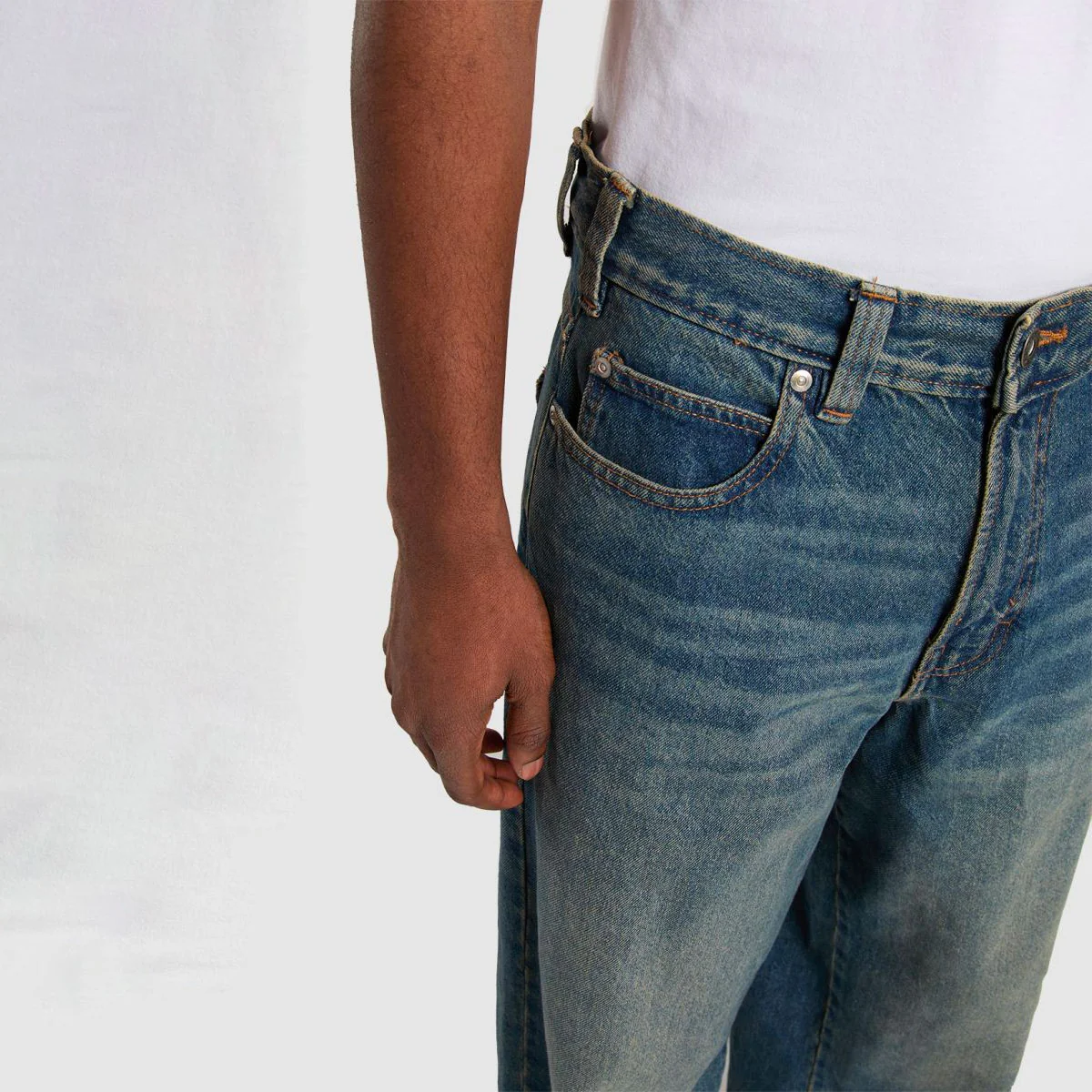 Jean coupe baggy en coton. Braguette à boutons et fermeture éclair, deux poches avant et arrière.
