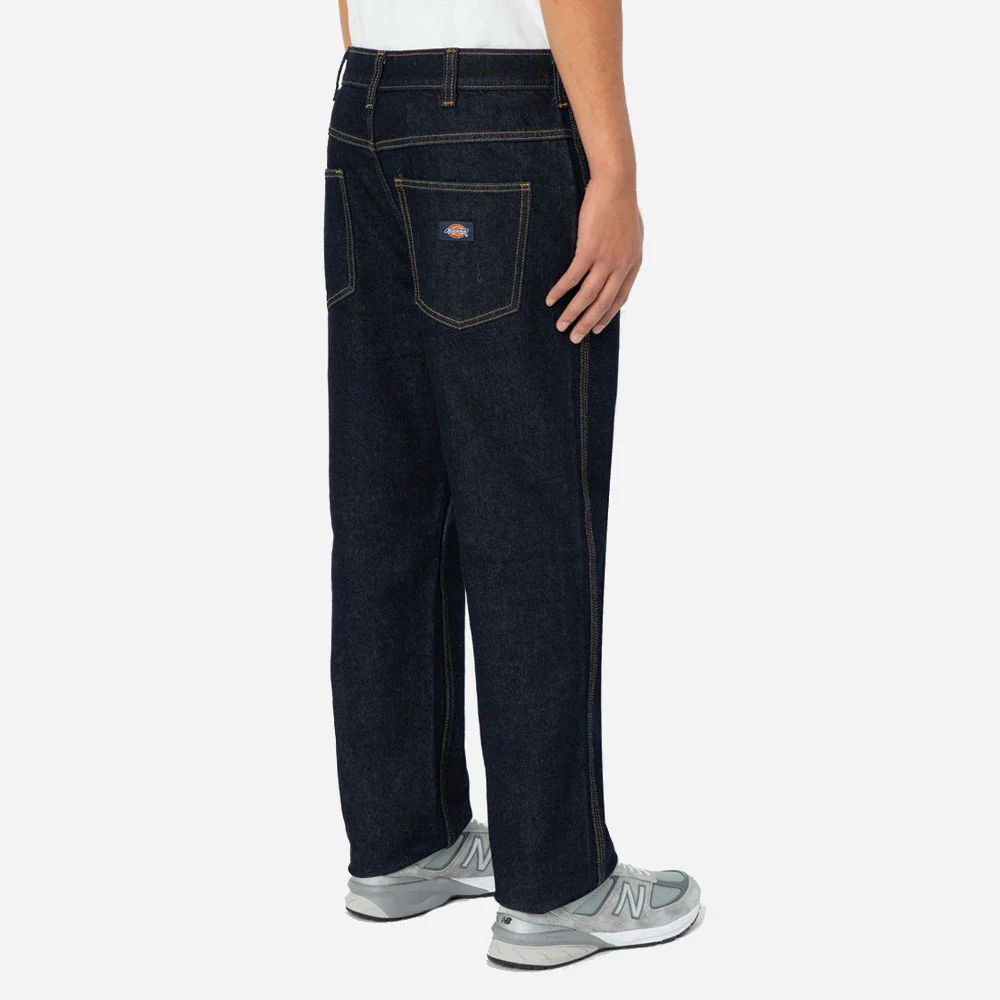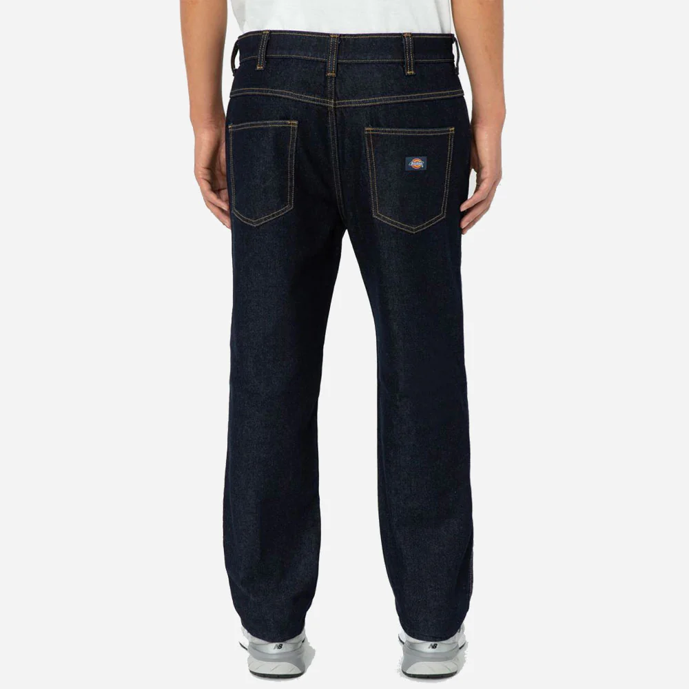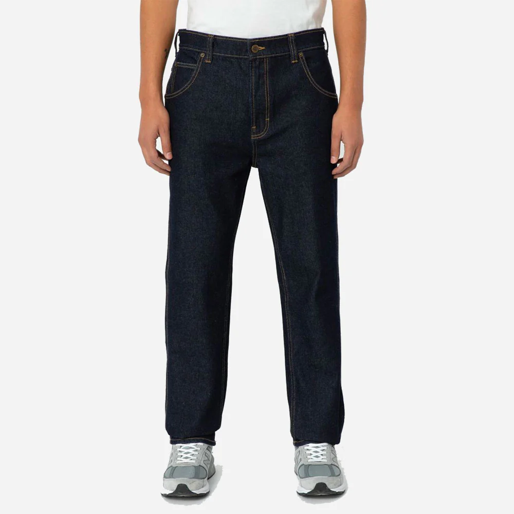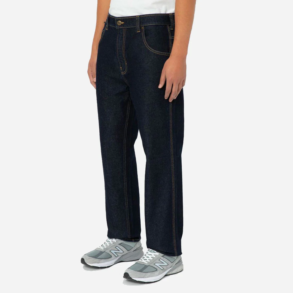Jean coupe droite en coton. Braguette à boutons et fermeture éclair, deux poches avant et arrière.