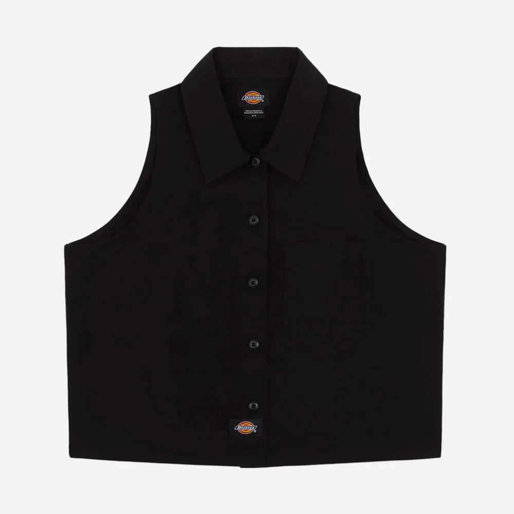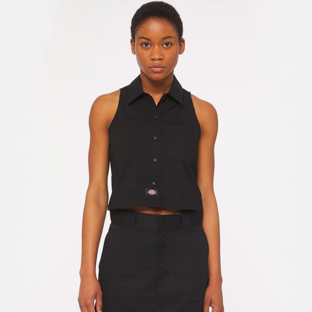 Chemise Dickies sans manches à col classique, patte de boutonnage complète, empiècement de même tissu au dos avec des fentes, deux poches sur le devant et de l’étiquette tissée emblématique de Dickies. Fabriquée en coton avec ajout d’élasthanne cette chemise classique d’inspiration workwear pour les femmes est conçue pour les chaudes journées d’été.