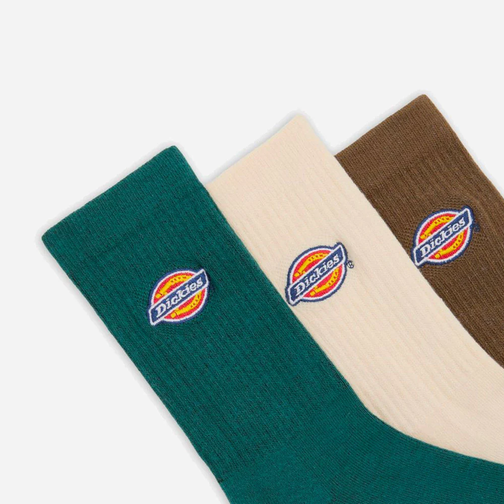 Pack de trois paires de chaussettes Dickies authentiques avec logo brodé sur la cheville et fabriquées à partir d’un mélange de poly-coton de haute qualité.