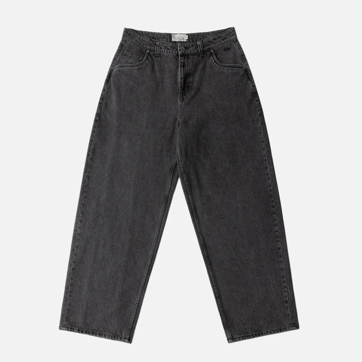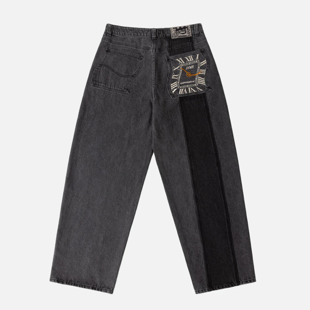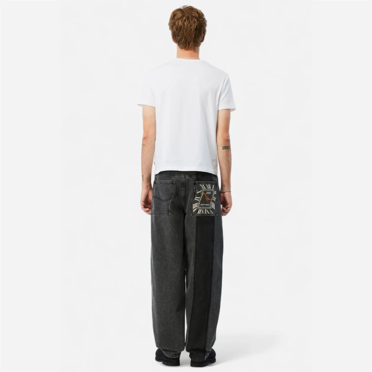 Le Baggy Denim Knowtomatic de Dime fusionne mobilité sans entraves et audace artistique brute. Confectionné en denim noir délavé haut de gamme, ce pantalon baggy capture l’essence skate tout en conservant la fluidité du port quotidien. Sa signature : une broderie « clock face » Knowtomatic qui métamorphose la poche arrière en pièce textile captivante; Les chiffres romains gravés, les aiguilles saillantes et les contours volontairement fragmentés incarnent une horloge en dissolution. Une bande verticale noire brute renforce la profondeur et crée un effet patchwork discret mais mémorable.