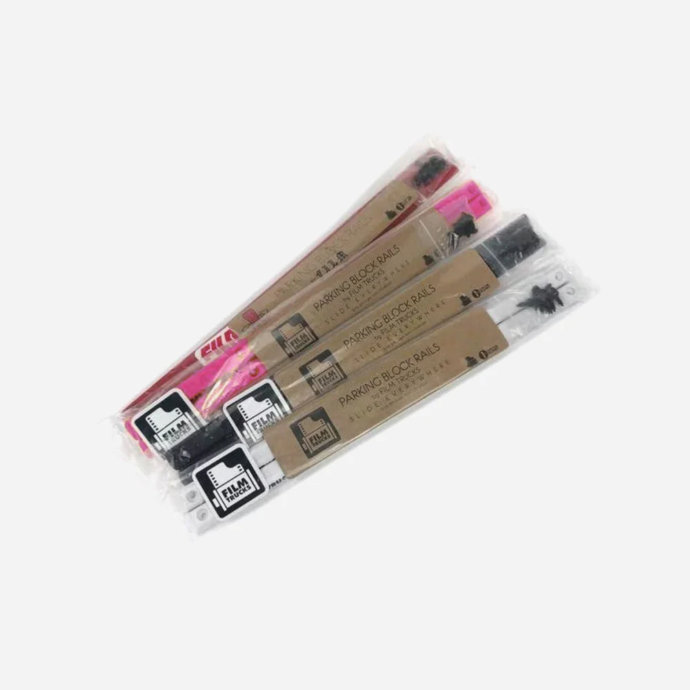 Jeu de deux barres de slides pour skateboards, avec autocollant 3M anti-vibrations et vis de montage.