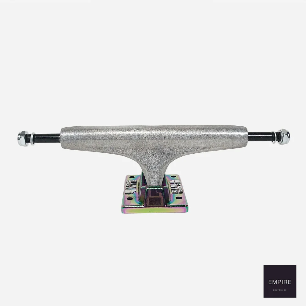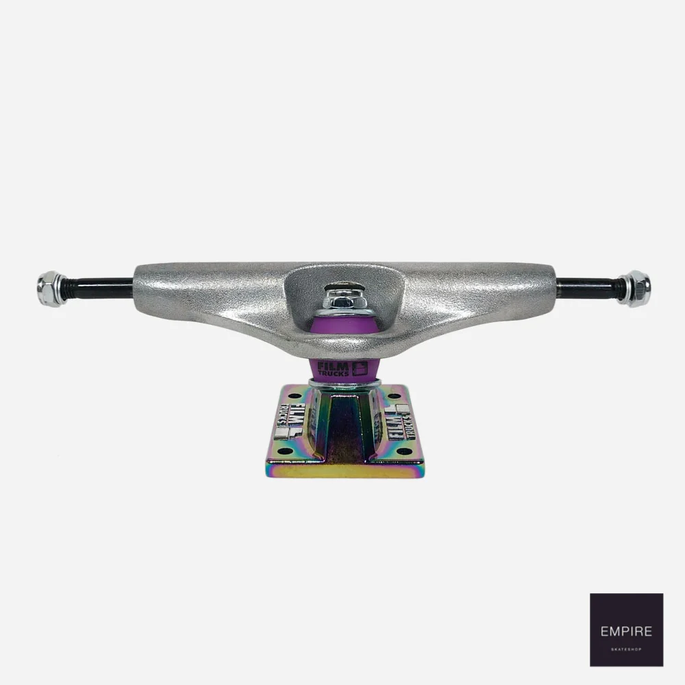 Le truck classique de chez Film poli à la machine avec un rendu faiblement lustré, mais avec une embase ionisée donnant un effet pétrole et des bushings violets.