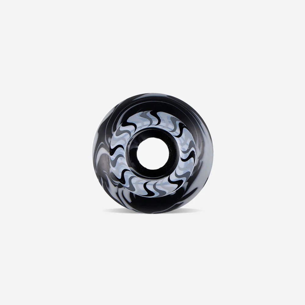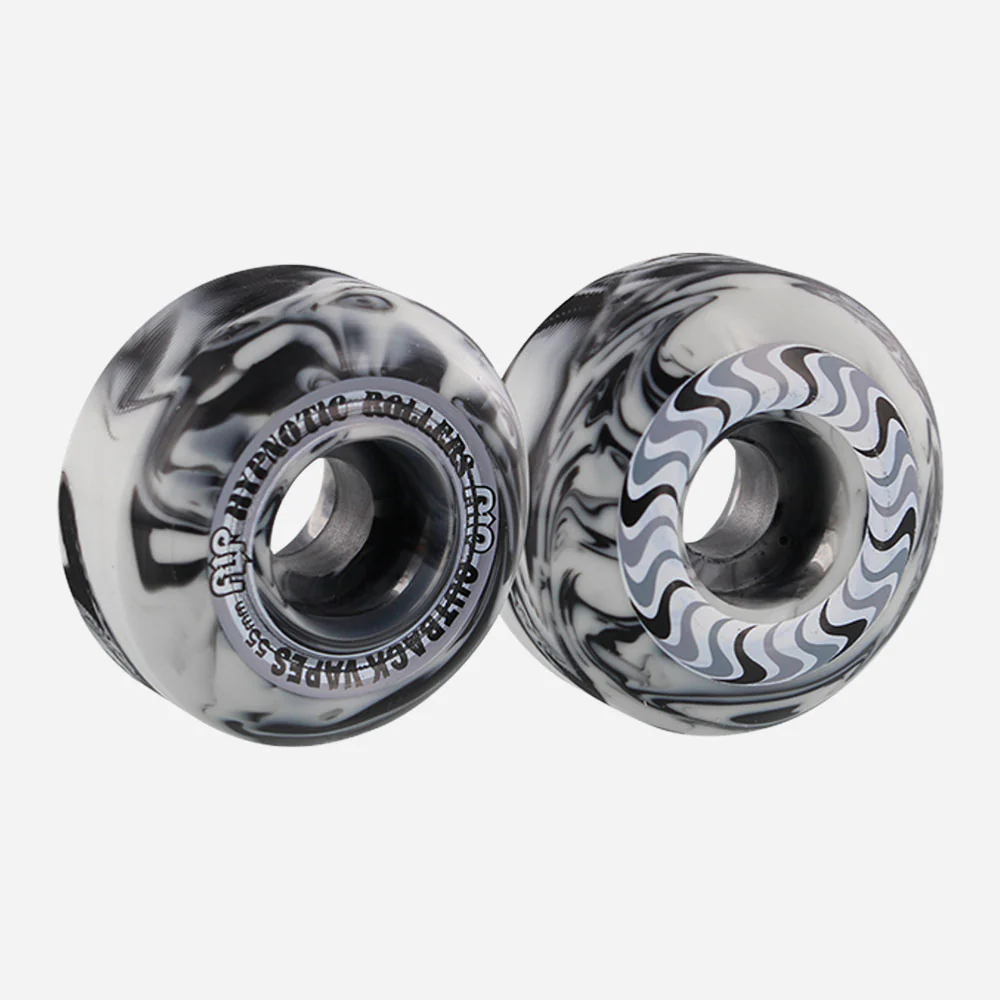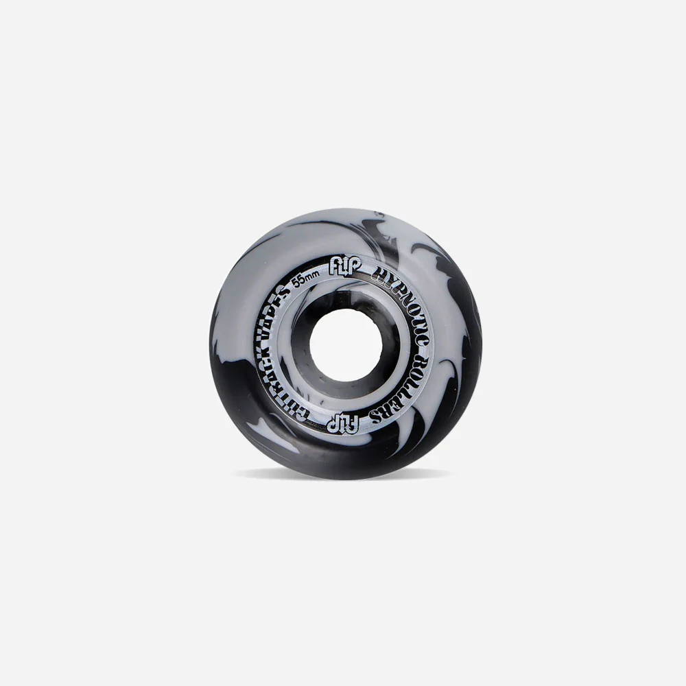 Jeu de 4 roues Flip pour skateboard, fabrication en uréthane grise sérigraphié des deux cotés. Formulation haute résistance, anti flat-spot. Duro 99A sur un shape classique avec « cut back » pour plus de légèreté et protéger le visuel.