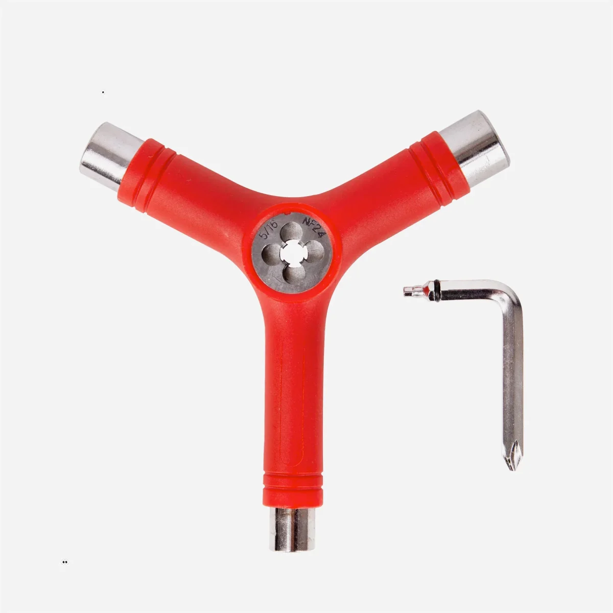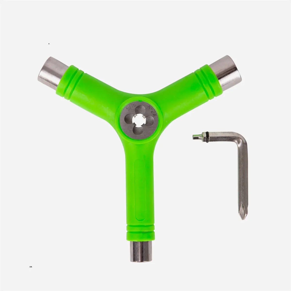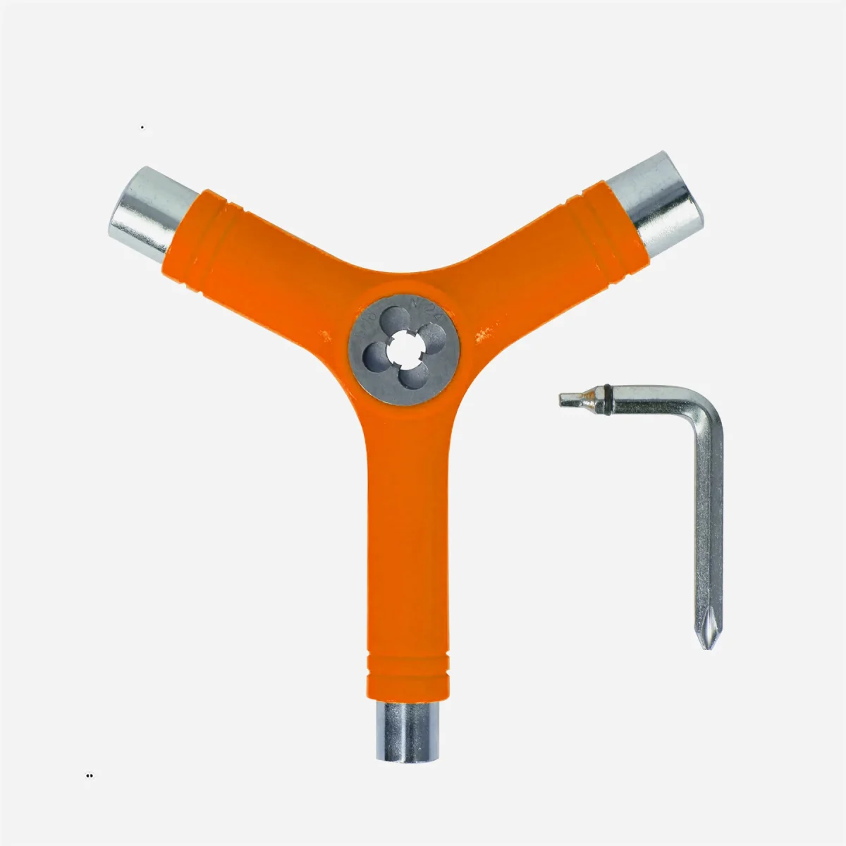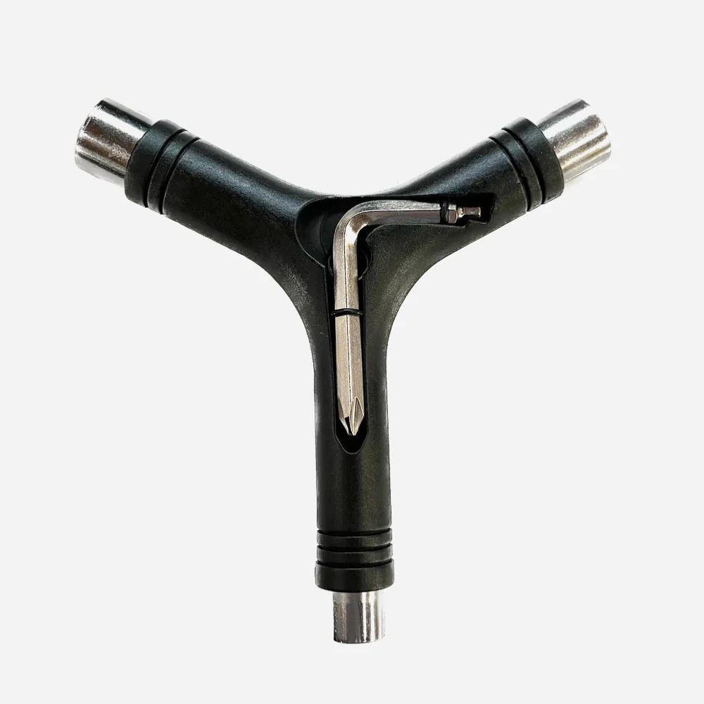 Outil complet pour monter, démonter et régler votre skateboard. En forme de Y, il contient une clef pour les boulons de kingpin, une clef pour les boulon d’axes et une clef pour le boulon des vis. Associé à une clef amovible avec un coté vis cruciforme et l’autre vis allen. Et en son centre un fileteur pour reprendre le pas de vis des axes de trucks.