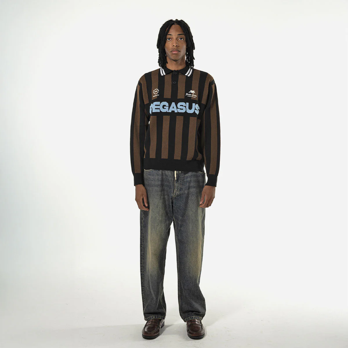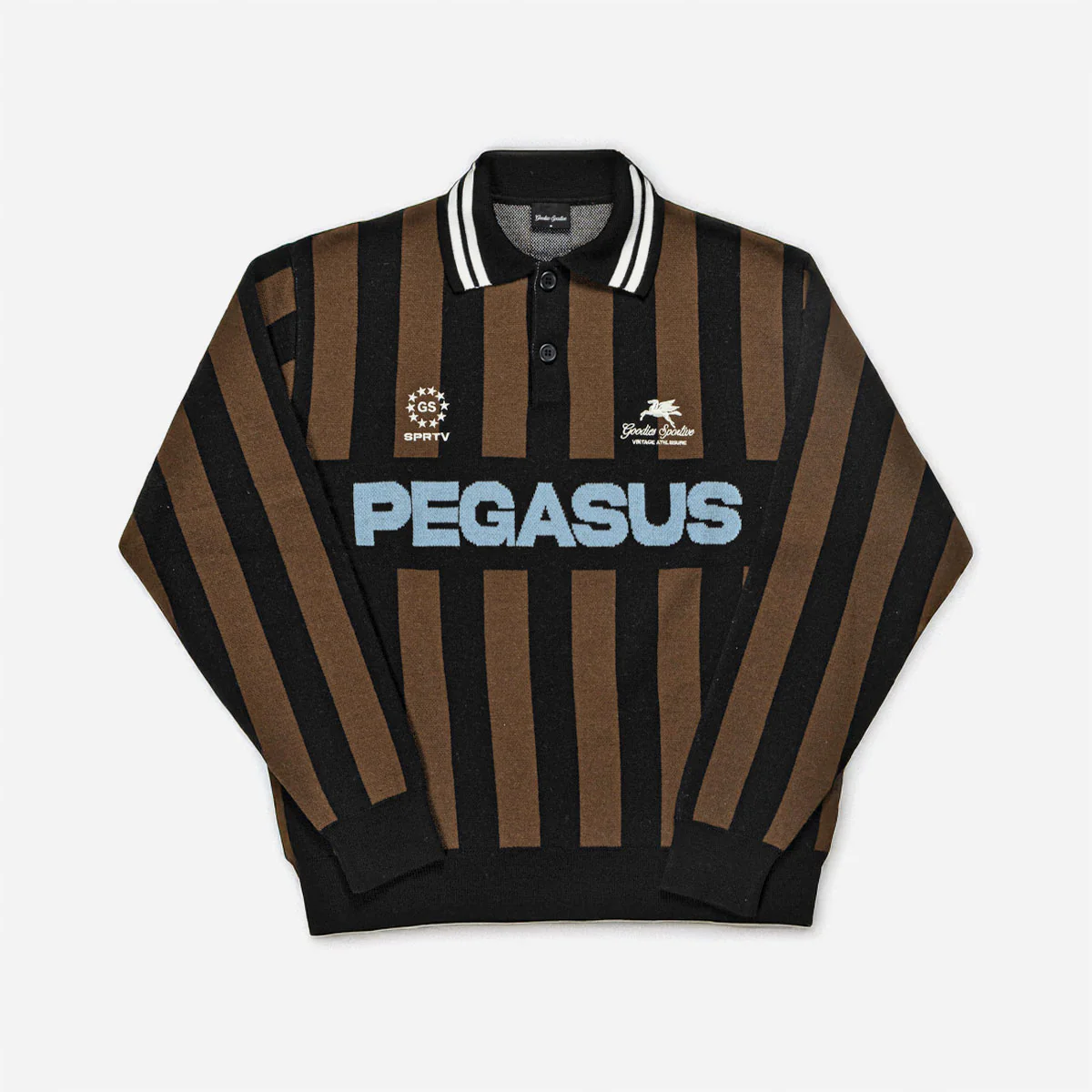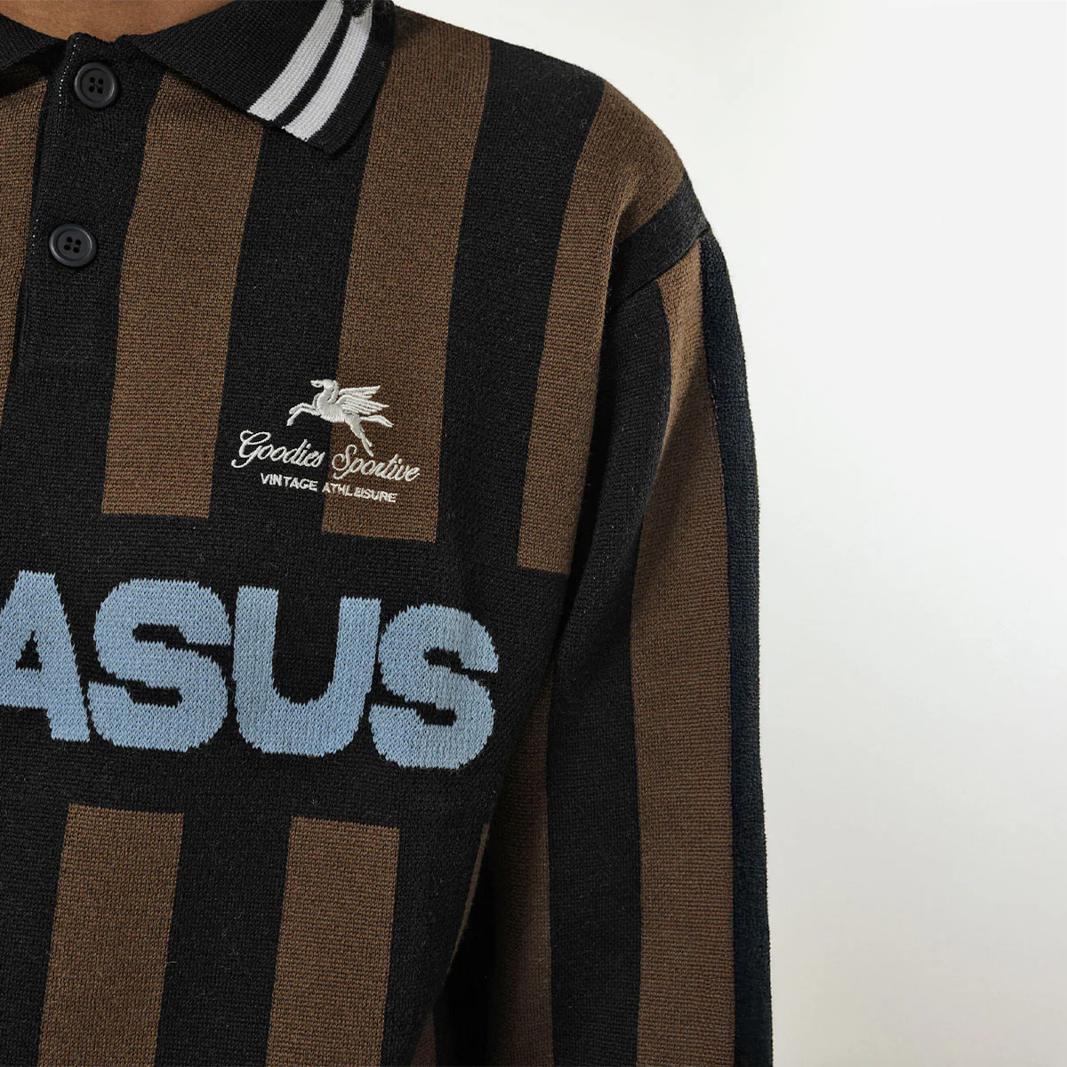 Pull en maille Goodies Sportive fabriqué en mélange de laine. Col polo boutonné et broderies contrastées sur la poitrine. Coupe boxy. Fabriqué en Europe.