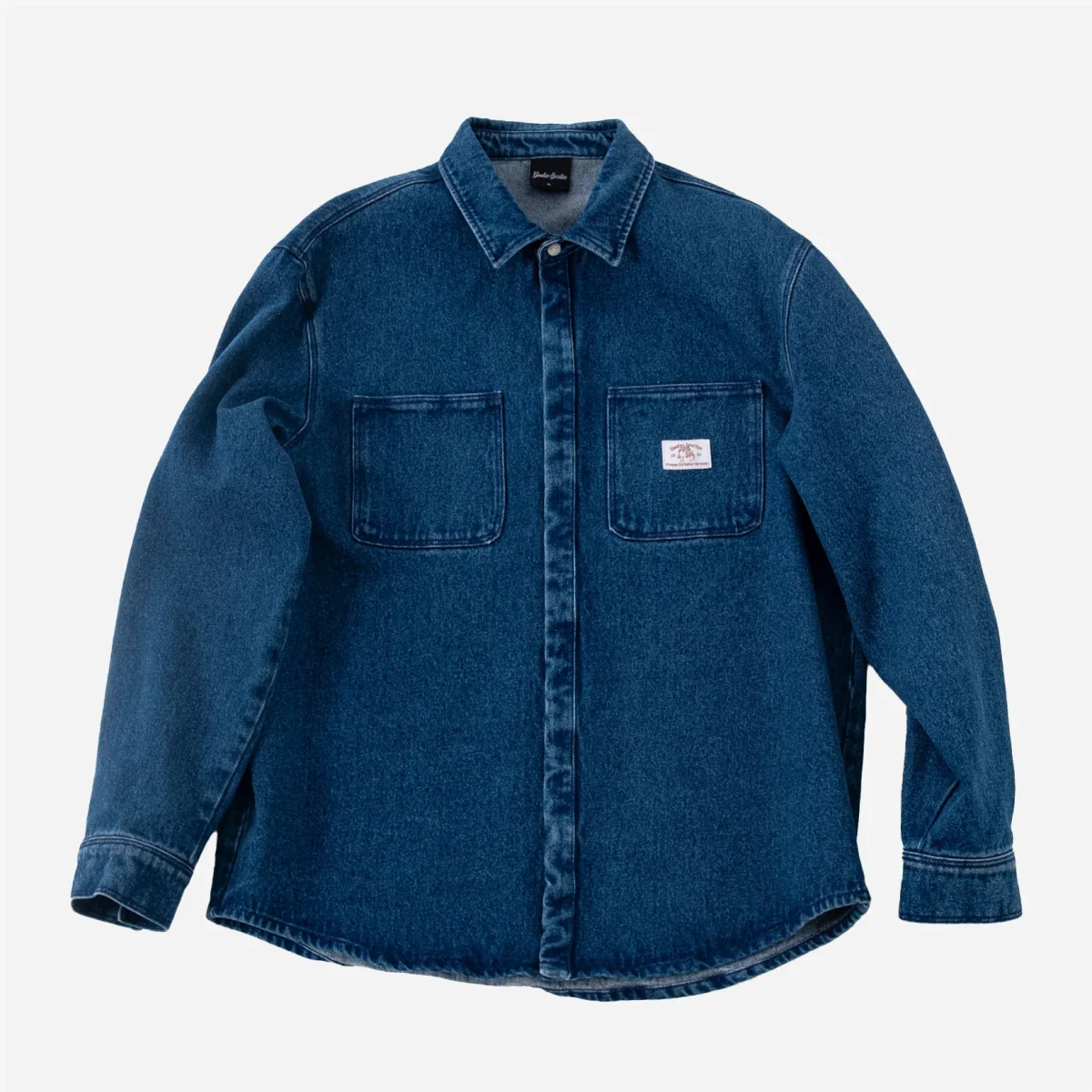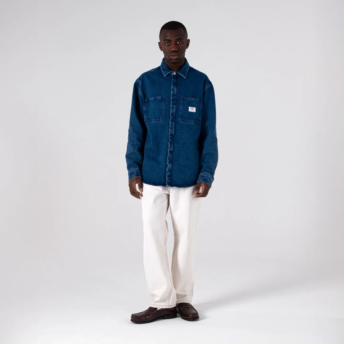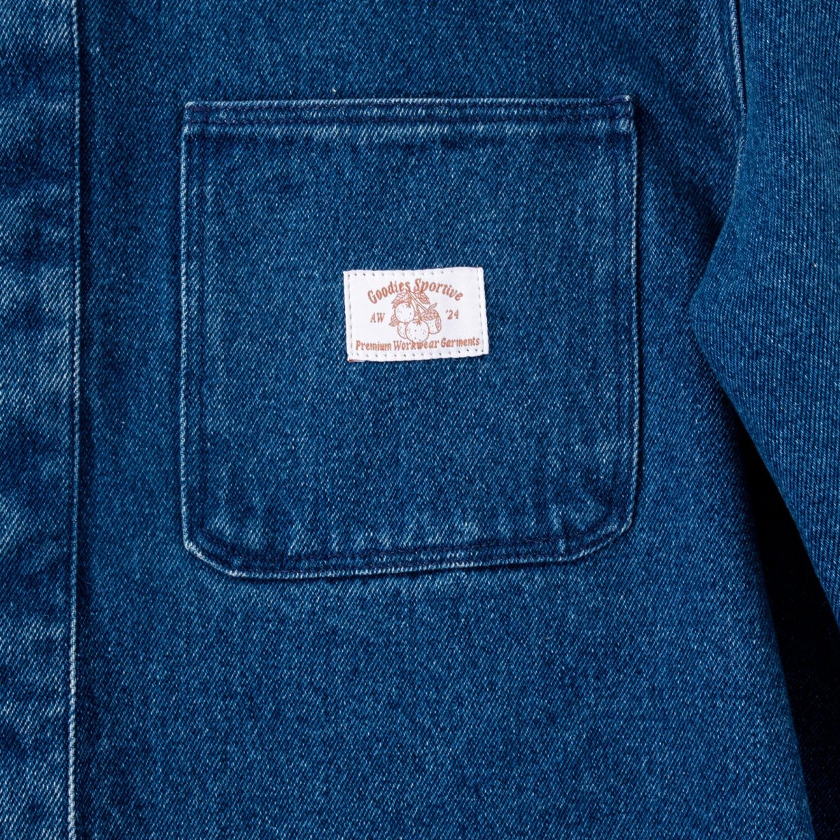 Chemise en jean Goodies Sportive, boutonnière invisible, coupe droite relax, patch cousu sur la poche poitrine gauche. Fabriqué en Europe.