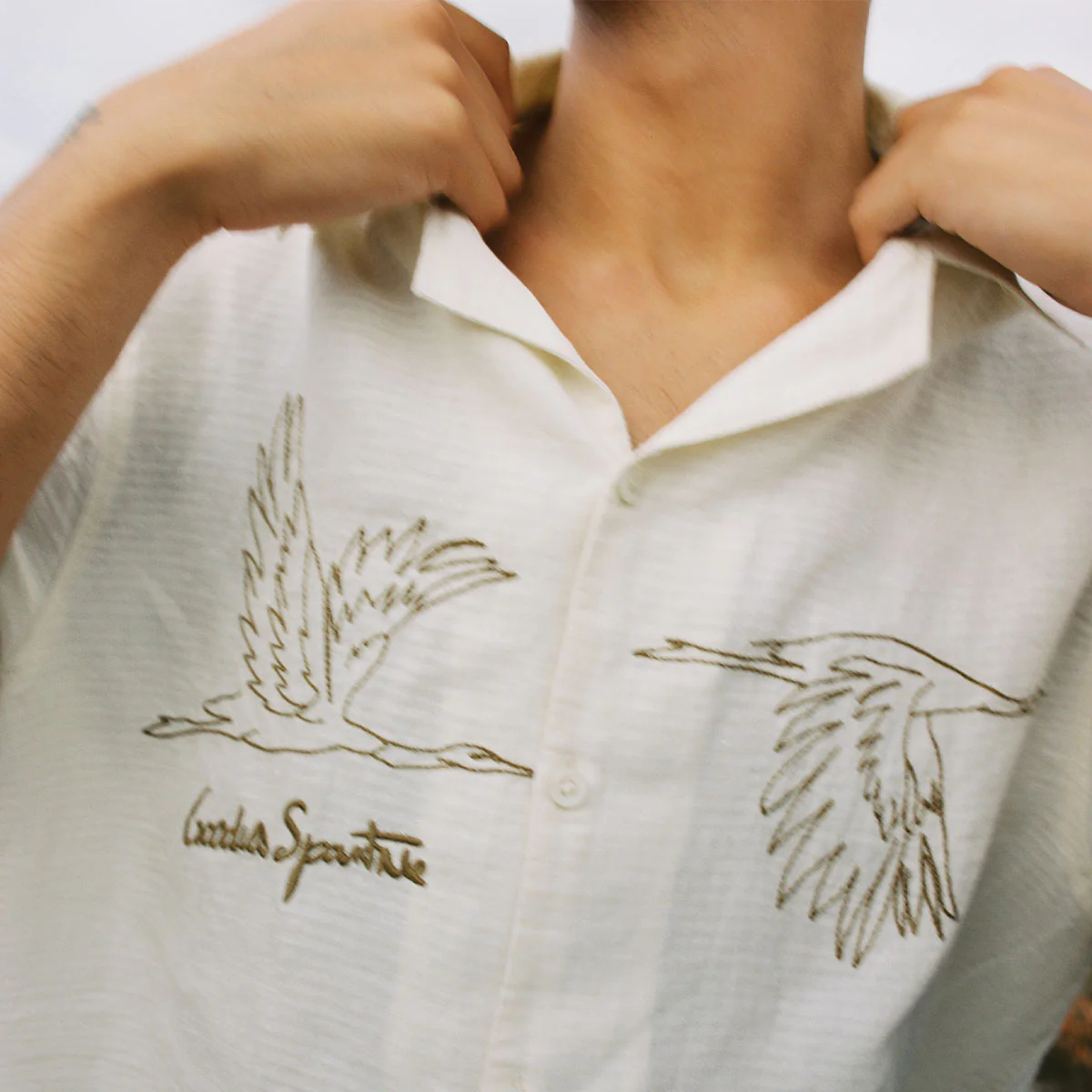 Chemise Goodies Sportive fabriquée dans un étonnant mélange coton, lin et de lyocell. Coupe boxy. Oies brodées à la main dans un style rustique, ainsi que le logo en broderie 3D.