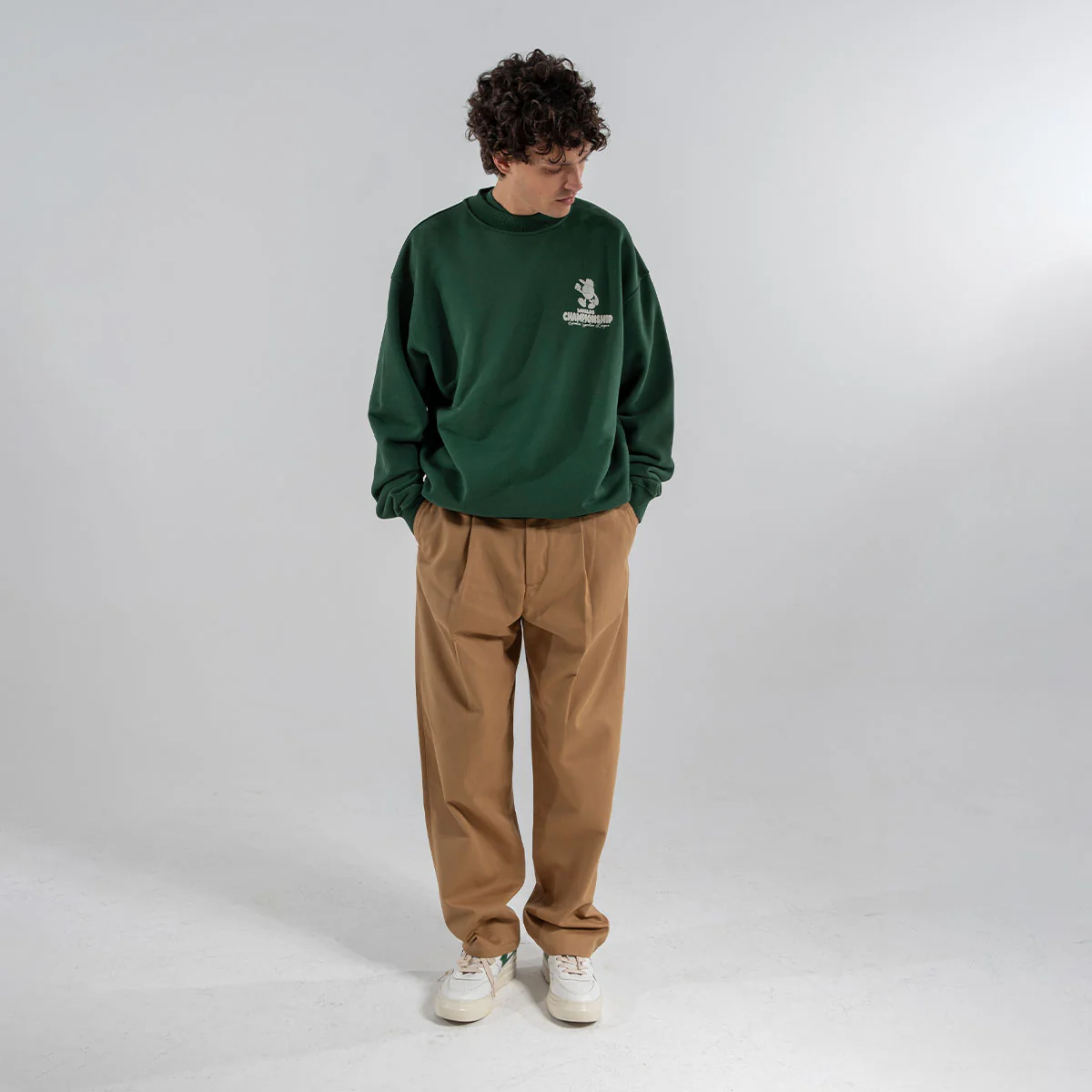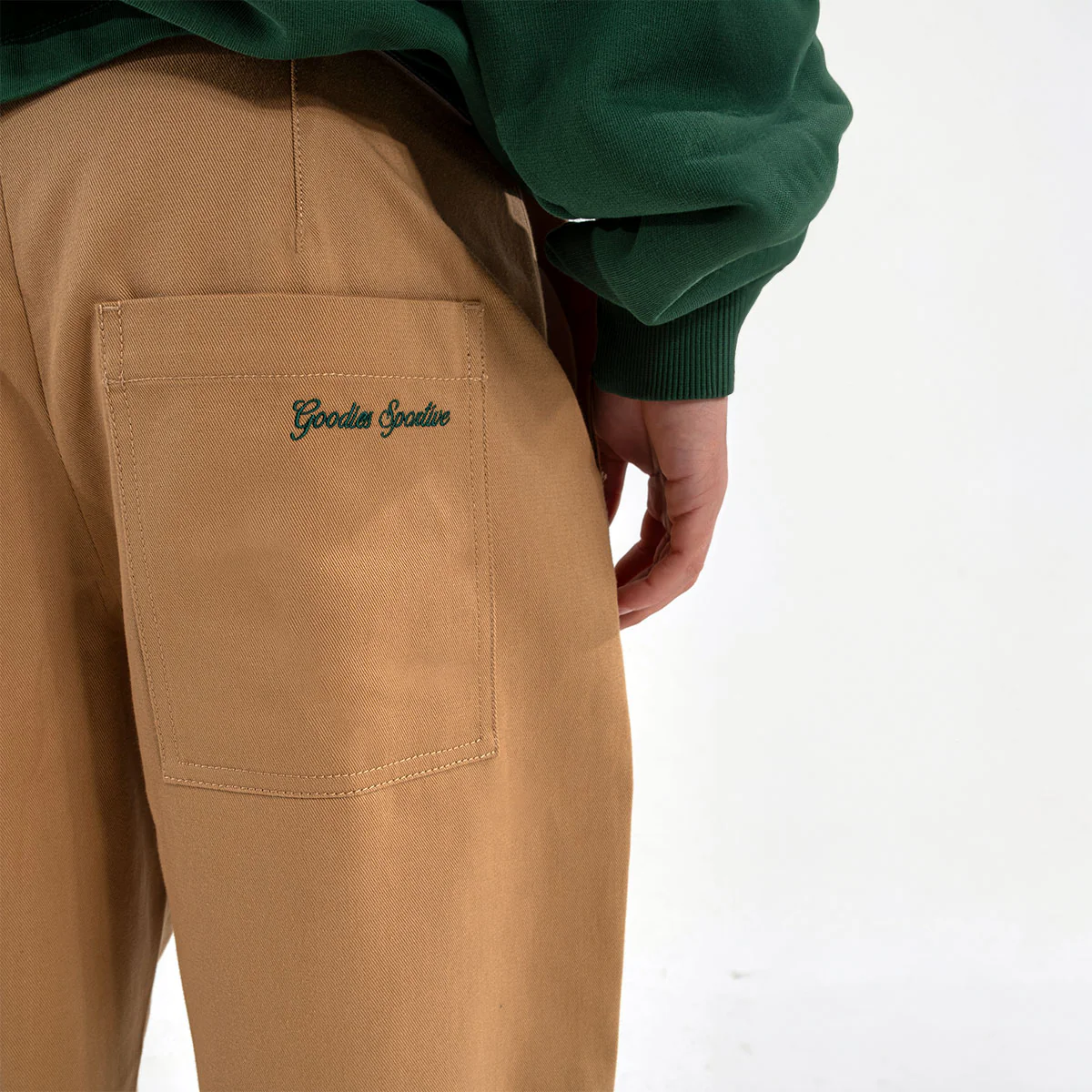 Pantalon chino à pinces Goodies Sportive. Fabrication en coton. Jambe large, fermeture à deux boutons. Broderie à l’arrière et jacron en cuir vert.
