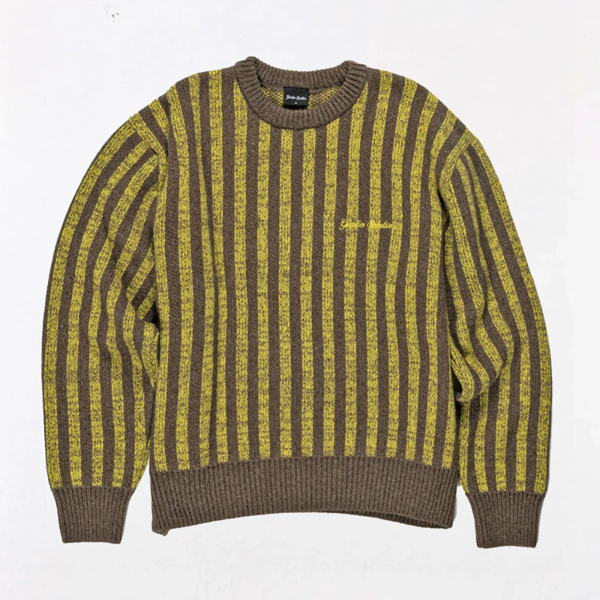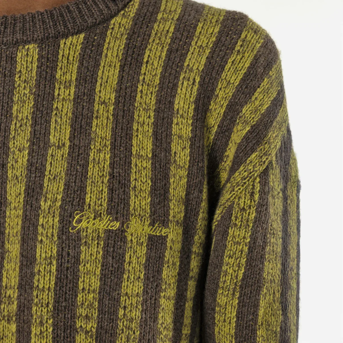 Sa palette de couleurs brun et moutarde en larges rayures lui confère une allure vintage inspirée des années 90, tandis que la broderie contrastée sur la poitrine vient signer l’identité Goodies Sportive avec subtilité. Ce mélange de classicisme et d’audace en fait une pièce aussi élégante que décontractée.