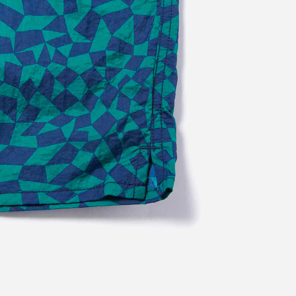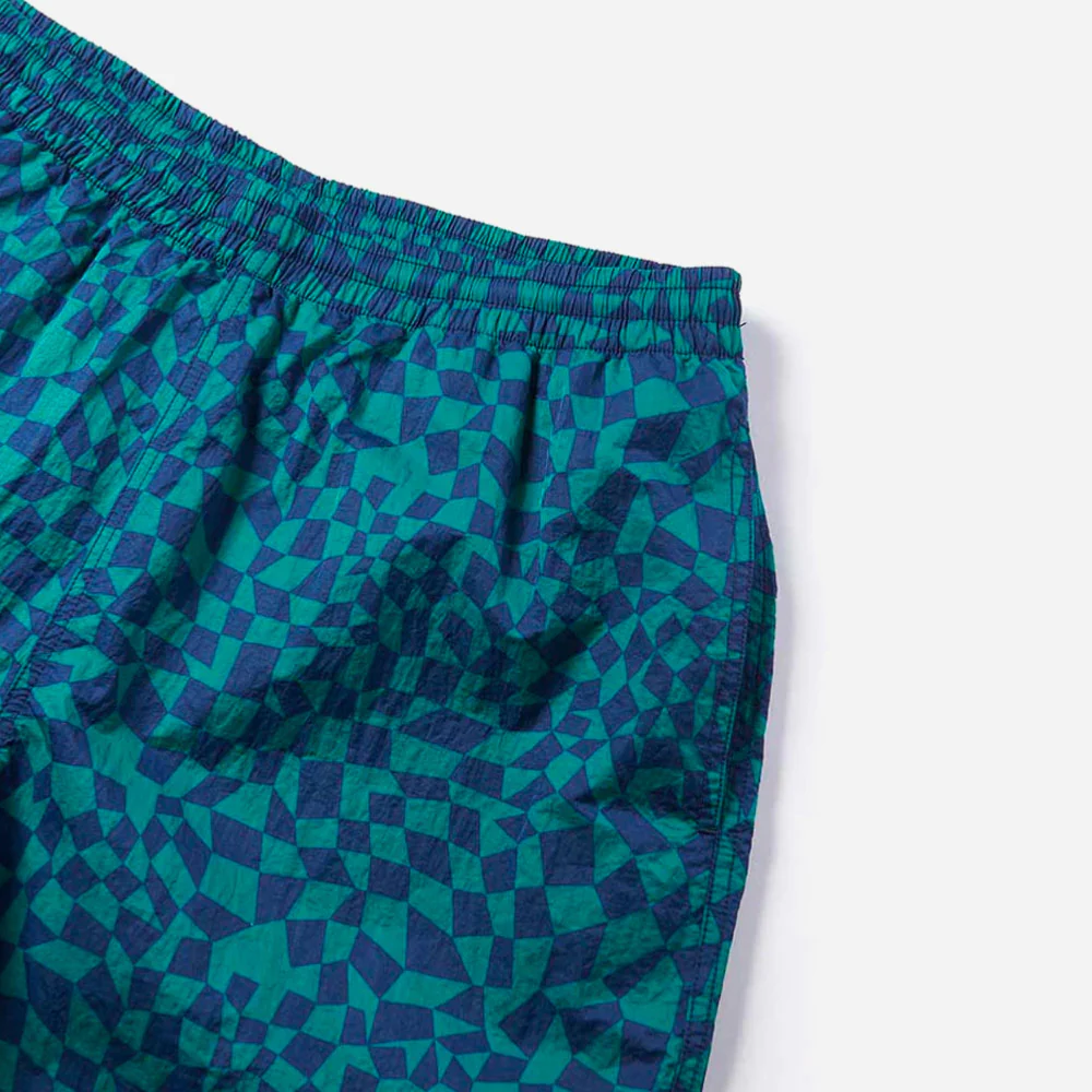 Short de bain avec doublure en maille, fabriqué dans une matière déperlante et compatible avec le chlore, qui donne l’impression d’avoir déjà été repassé mais qui ne nécessite pas de repassage. Il est pliable et donc très pratique à transporter. Le motif général utilise des coutures contrastées de couleurs unies et des carreaux géométriques.