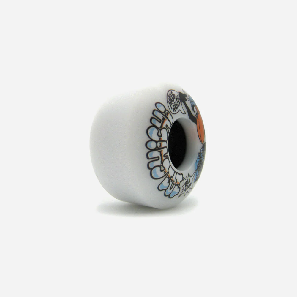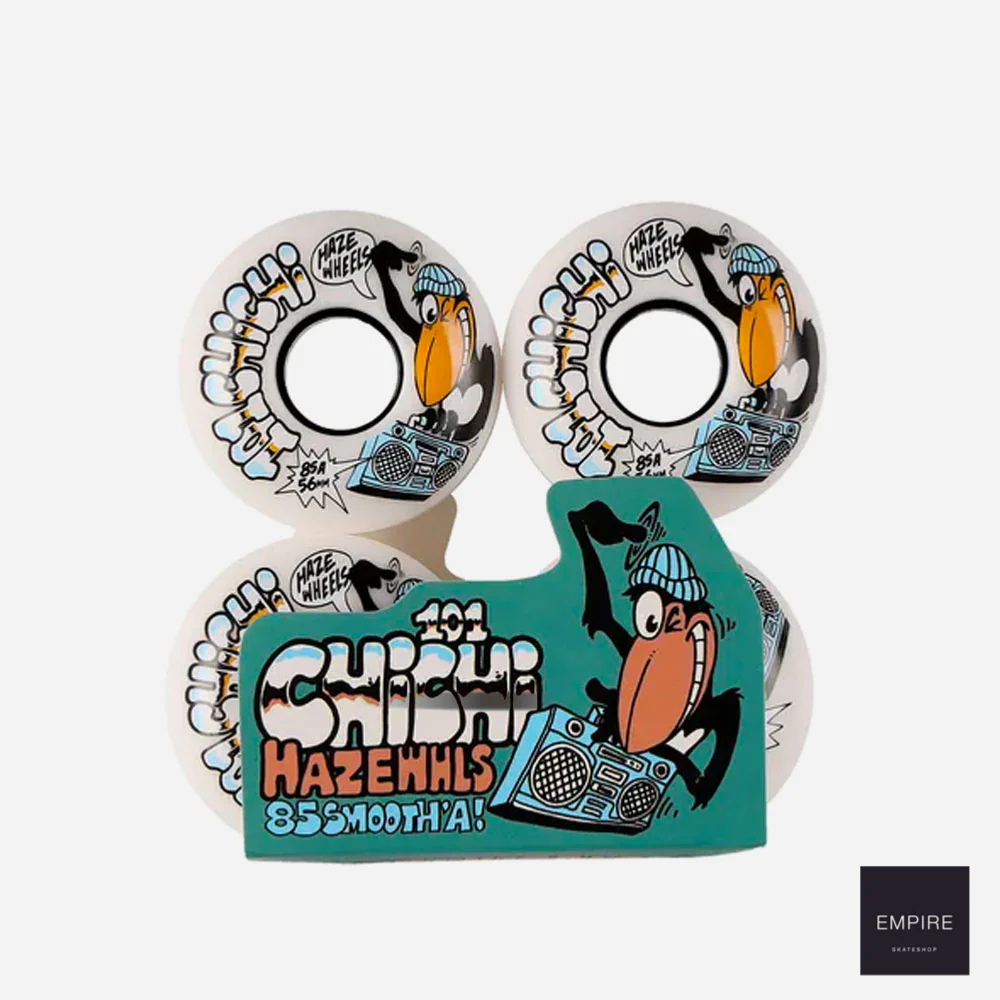 Jeu de 4 roues Haze Wheels pour skateboards, fabriquées en uréthane blanche haute qualité et sérigraphiées sur une face. Ces roues à la dureté basse sont idéale pour une pratique cruiser et bowl. Modèle de Yann Garin, visuel par Funcographics.