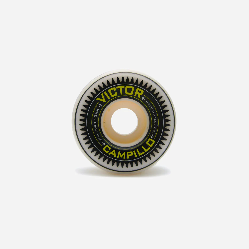 Jeu de 4 roues de skate en uréthane blanche sérigraphié. Pro-modèle de Victor Campillo. Formulation Beyond Formula. Duro 99A sur un shape conique de diamètre 53 x 34 mm.