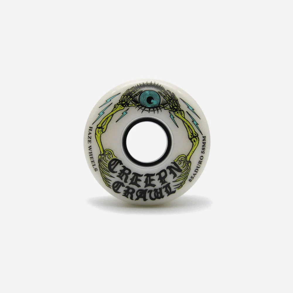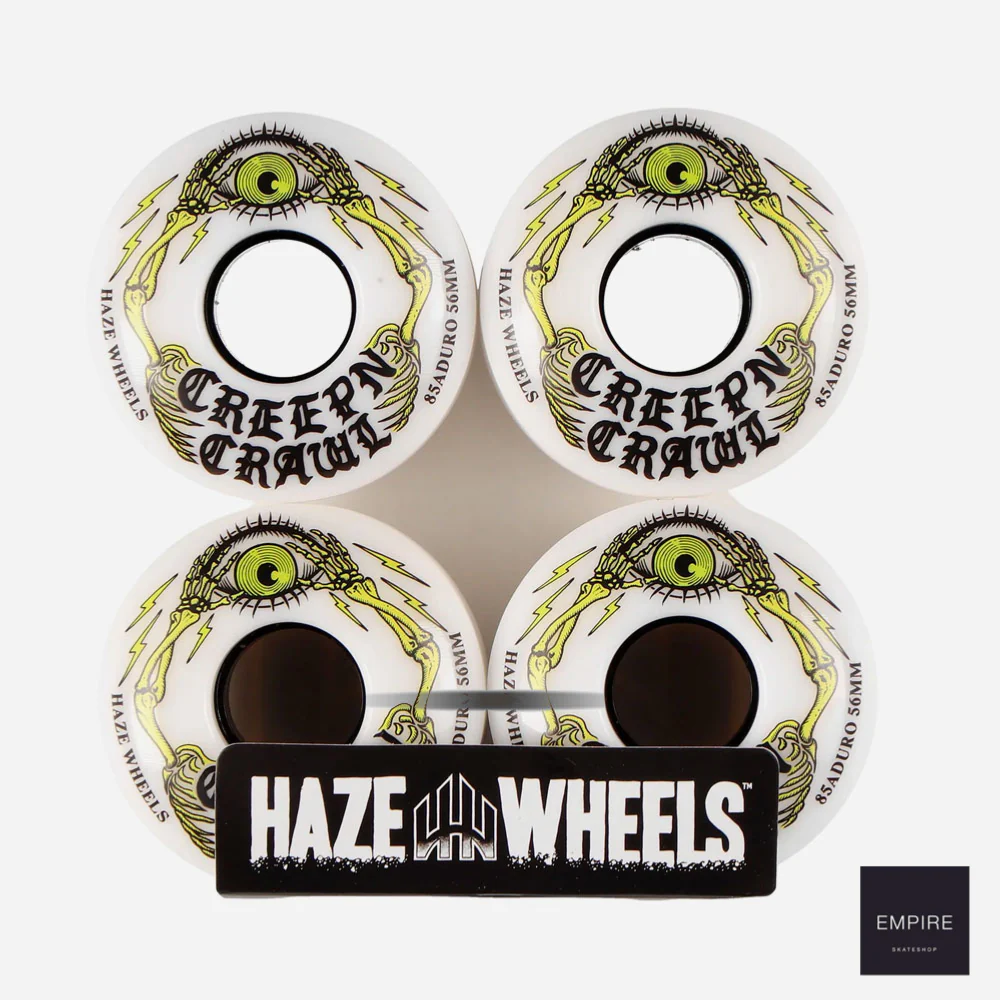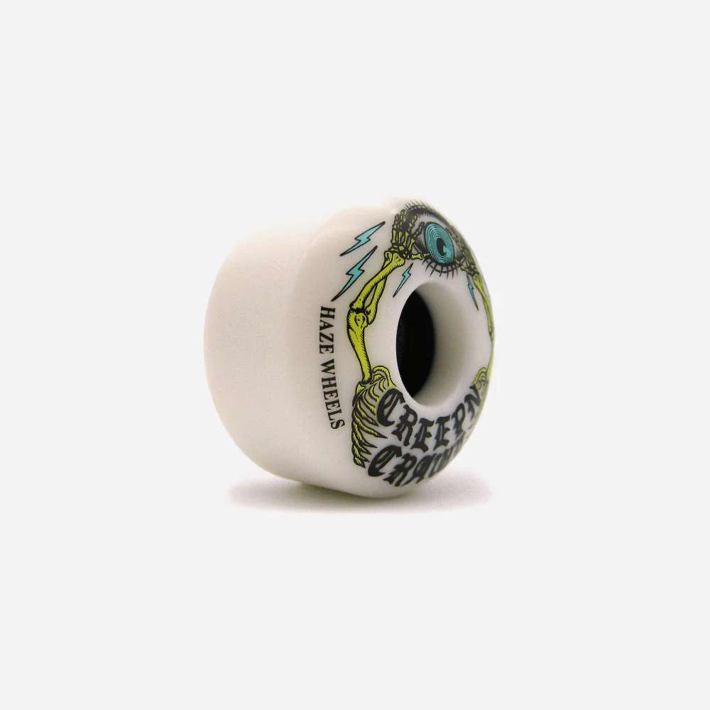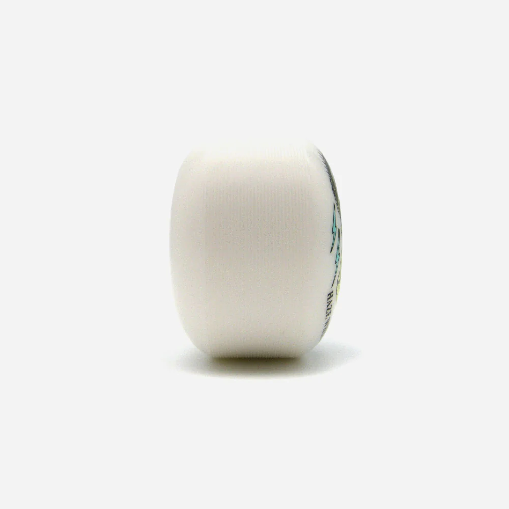 Jeu de 4 roues de skateboard Haze en uréthane blanche sérigraphié sur une face. Dureté basse avec dureté renforcée sur le cœur de la roue : Duro 85A avec coeur renforcé, sur un shape classique. Visuel par Funcographics.