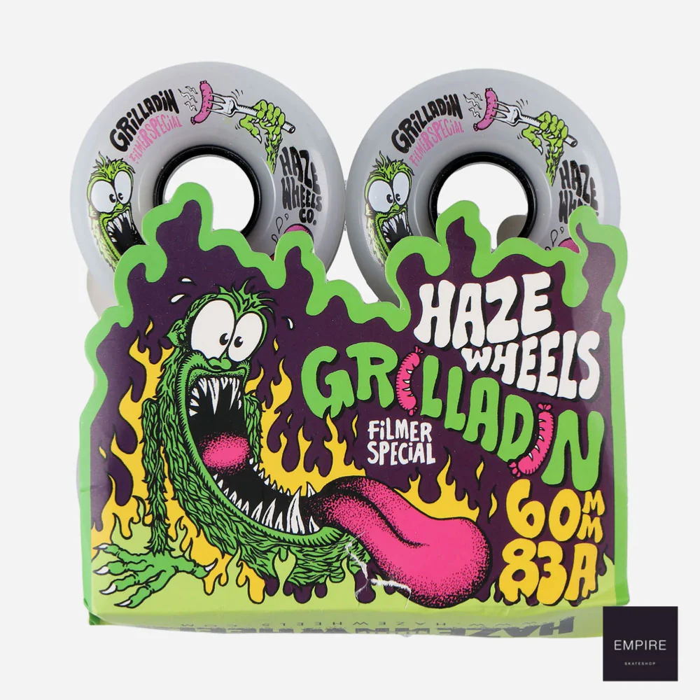 Jeu de 4 roues de skate en uréthane sérigraphié. Dureté basse avec dureté renforcée sur le cœur de la roue : Duro 83A sur un shape conique de diamètre 60 mm par 40 mm de large et avec une surface de contact de 27 mm.