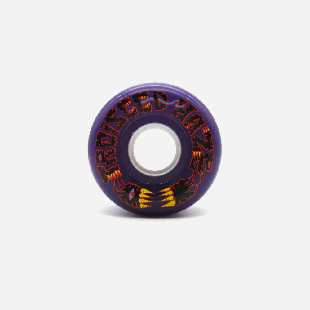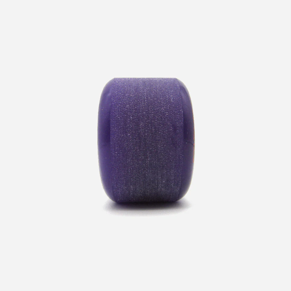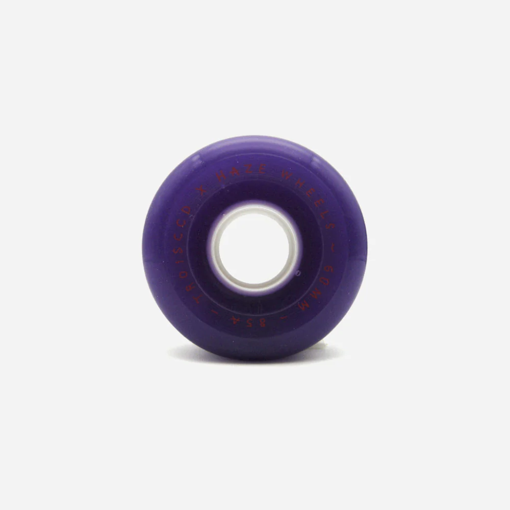 Jeu de 4 roues de skateboard Haze Wheels en uréthane violette sérigraphié, en collaboration avec 3CCD. Duro 85A sur un shape rond de diamètre 60mm x 40mm. Visuel par Cesar Dubroca.