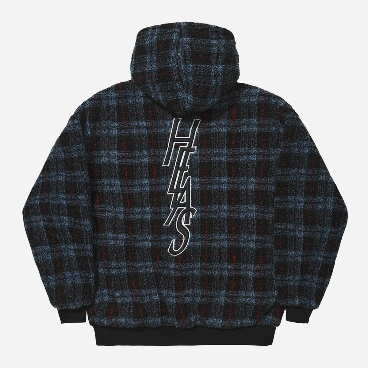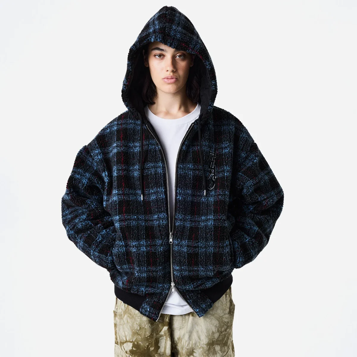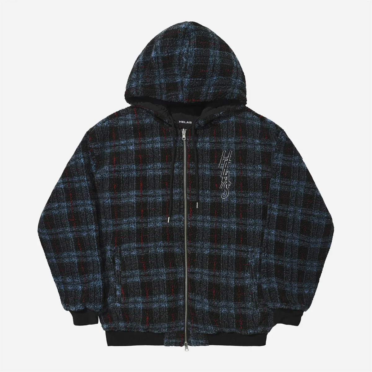Veste Hélas, réversible, zippée et à capuche. Un coté en sherpa à carreaux et l’autre en satin noir. Coupe ample, poches passepoilées. Logo hélas brodé sur la poitrine et dans le dos.