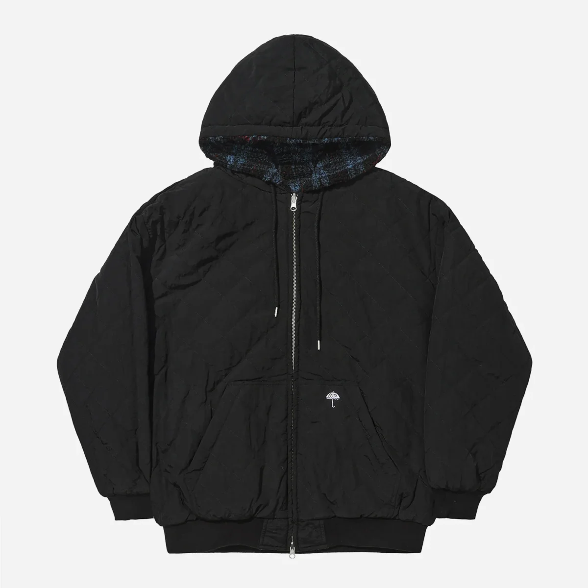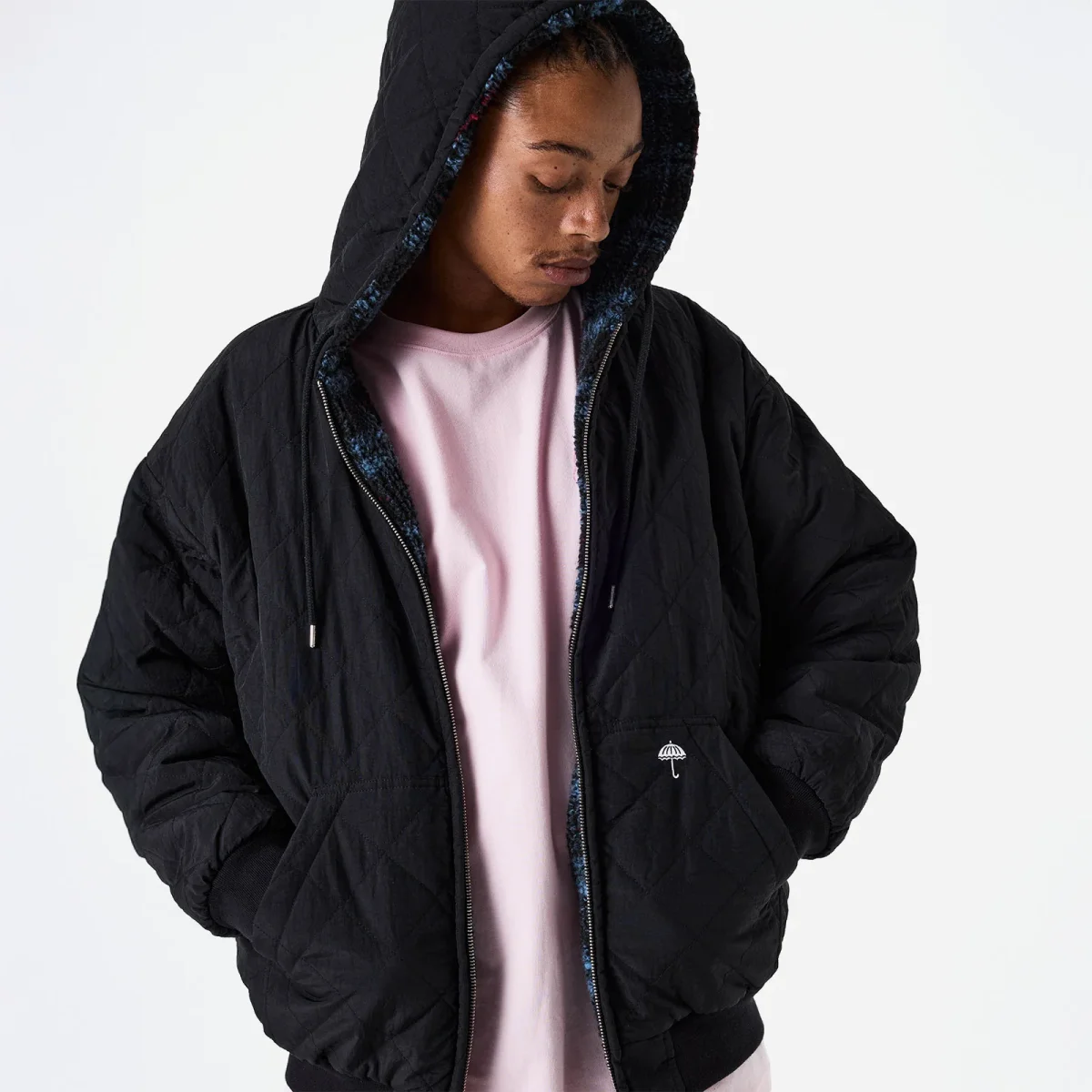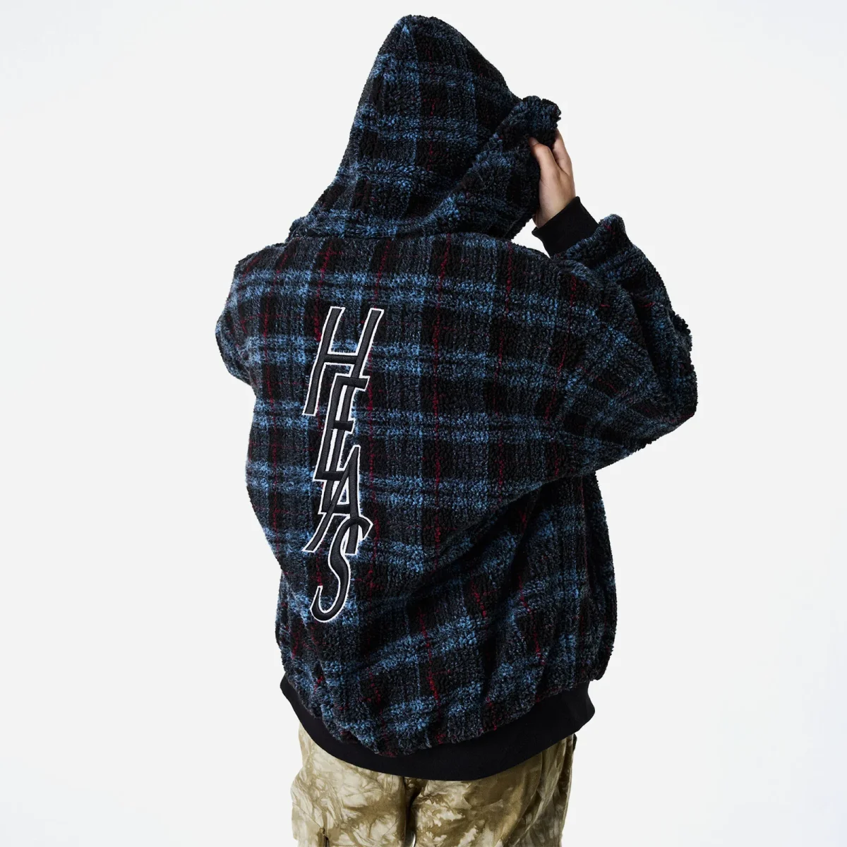 Veste Hélas, réversible, zippée et à capuche. Un coté en sherpa à carreaux et l’autre en satin noir. Coupe ample, poches passepoilées. Logo hélas brodé sur la poitrine et dans le dos.