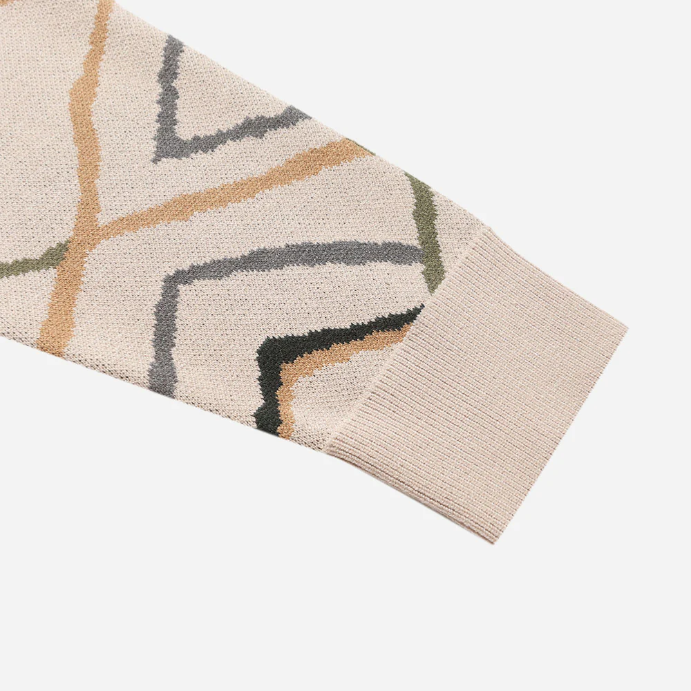 Pull avec col polo trois boutons, motif jacquard, coupe droite et ample, patch Hélas sur la poitrine.