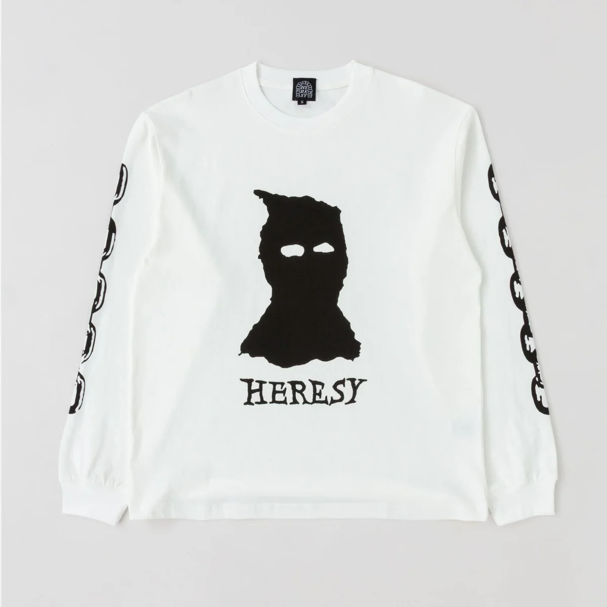 T-shirt Heresy à manches longues en jersey 100 % coton épais, avec imprimé « Cultist » sur le devant et « Chains » sur les manches. Ce t-shirt à la coupe carrée a été prélavé pour éviter tout rétrécissement.