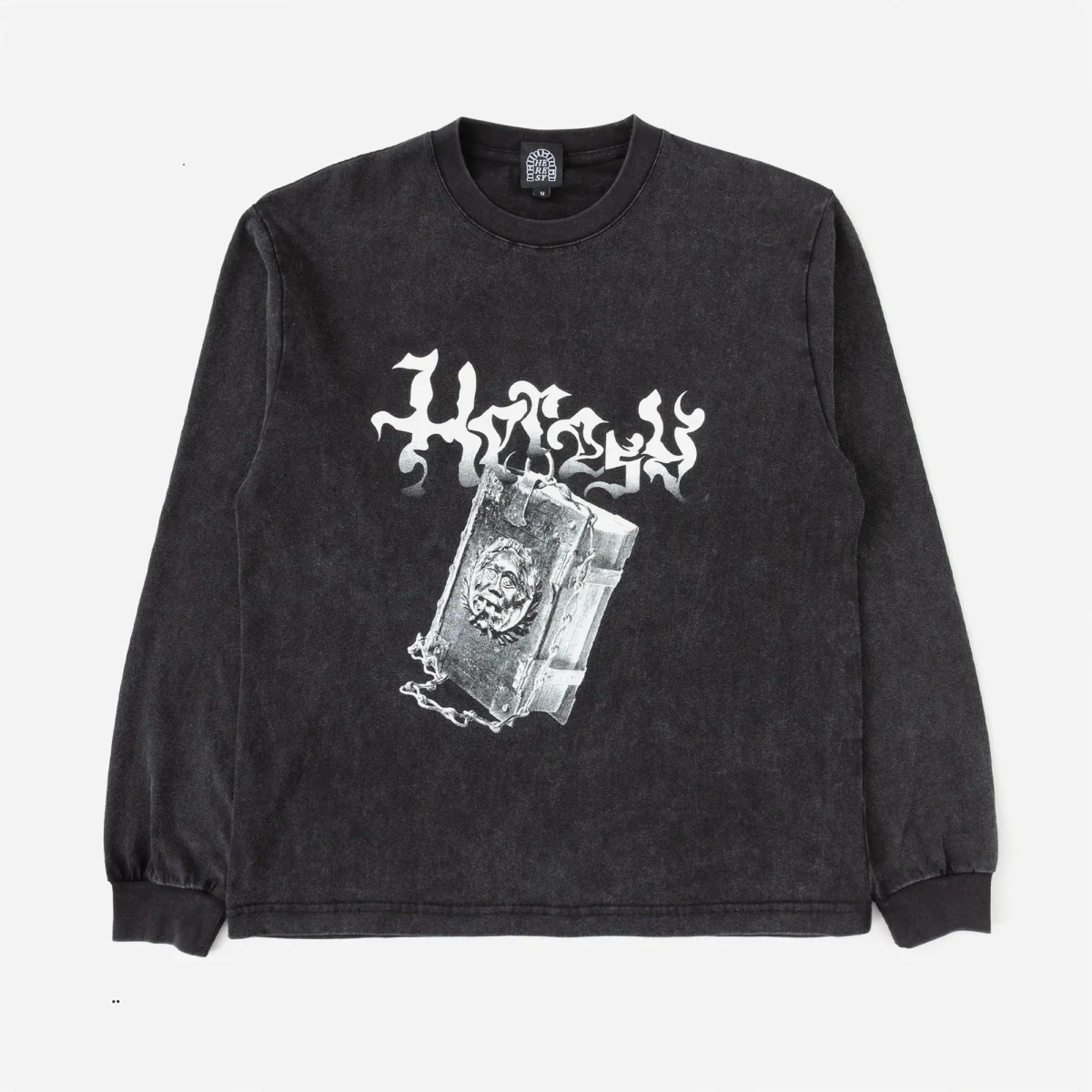 T-shirt manches longues Heresy, fabriqué en jersey de coton épais avec lavage enzymatique pour un look vintage incroyable. Coupe boxy et visuel sérigraphié sur le devant.