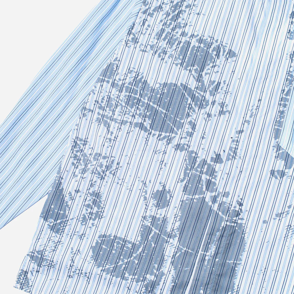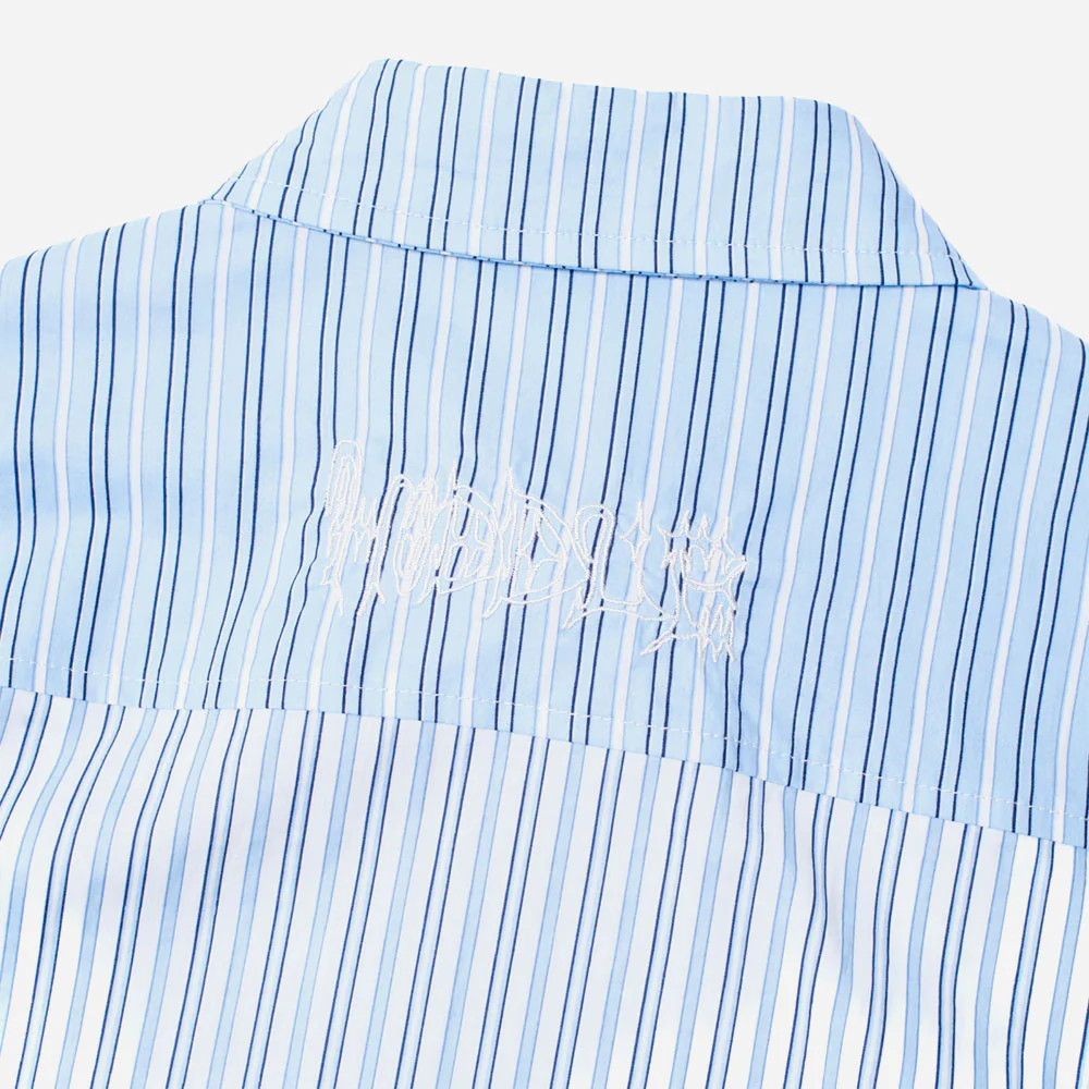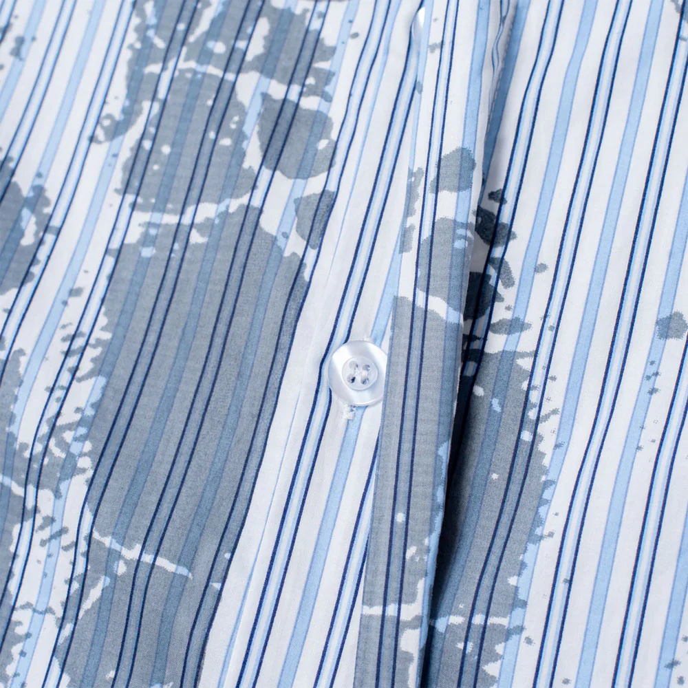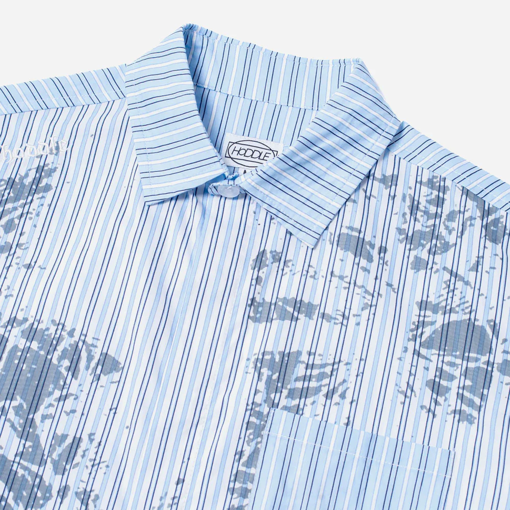 Chemise Hoddle, coupe droite classique avec manches longues, col ouvert et décontracté. Patte de boutonnage avec boutons nacrés cachés. Broderies ton sur ton sur le devant et dans le dos. Fabrication en coton à rayures avec large sérigraphie sur le devant, réalisée en collaboration avec Marli Maddison.
